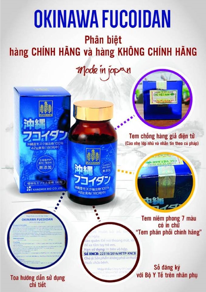 • Giai đoạn xạ ị hoặc hóa ị: Fucoidan giúp kích hoạt quá trình tự chết của tế bào ung thư, đồng thời bao vây lại tế bào ung thư khiến chúng không thể di căn qua khu vực khác. Khi bệnh nhân đã sử dụng phương pháp hóa, xạ ị cơ thể người bệnh bị suy kiệt nhanh chóng, các tế vào xung quanh bị tiêu diệt bởi hóa chất vì vậy Fucoidan giúp sản sinh ra các tế bào mới giúp người bệnh nhân nhanh chóng phục hồi sau mỗi lần điều ị. Hiện nay có tới 70% bênh nhân ung thư tử vong do cơ thể bị suy kiệt khi dùng hóa , xạ ị. Nhiều nghiên cứu đã chỉ ra rằng Fucoidan có thể ngăn chặn sự phát triển của các tế bào ung thư và bảo vệ tế bào xung quanh và tái tạo tế bào mới. CÔNG DỤNG: Phòng và hỗ trợ ức chế mọi loại ung thư và bất kì giai đoạn nào của bệnh. Ức chế sự tăng trưởng của tế bào ung thư, chống khối u lành tính và ác tính, cô lập làm cho tế bào ung thư tự hủy, bảo vệ và phát triển các tế bào mới. Giảm các tác dụng phụ của hóa ị và xạ ị như: Buồn nôn, rụng tóc, mệt mỏi, tiêu chảy, sốt. Nâng cao sức đề kháng, tăng cường hệ miễn dịch cho cơ thể. Phòng và hỗ trợ điều ị xơ vữa động mạch, hạn chế mỡ trong máu, điều hòa huyết áp. Ức chế cơ chế gây béo phì. Kéo dài tuổi thọ, bồi bổ cơ thể. THÀNH PHẦN: Chiết xuất 100% từ rong nâu Mozuku tại vùng biển Okinawa, Nhật Bản. Hàm lượng Fucoidan: trong mỗi viên chứa 235mg Fucoidan tinh chất. ĐỐI TƯỢNG: Bệnh nhân ung thư ở mọi giai đoạn và mọi loại ung thư, bệnh nhân ung thư đang trong quá trình điều ị như: phẫu thuật, hóa ị, xạ ị… Người có khả năng cao mắc bệnh ung thư, theo chỉ định của bác sĩ. Người có sức đề kháng và miễn dịch kém, thường xuyên bị bệnh và mệt mỏi. Người muốn phòng ngừa ung thư, bồ bổ cơ thể và kéo dài tuổi thọ. CÁCH DÙNG: Phòng bệnh: 2 viên/ngày. Bệnh nhân u bướu: 3-6 viên/ ngày. Điều ị: 6-10 viên/ngày chia làm 2 lần. Uống với nước ấm. Sử dụng trước ăn.