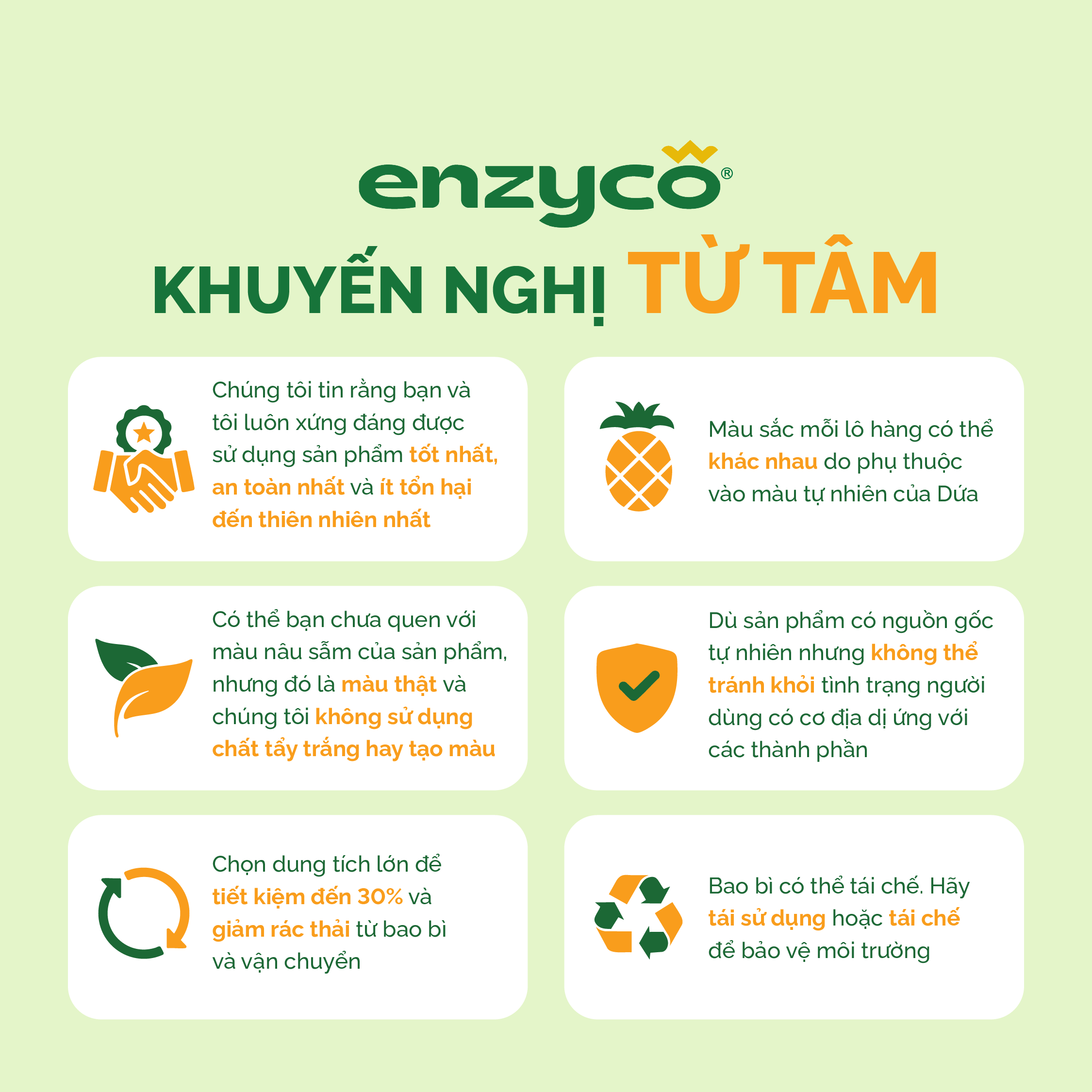 Nước ngâm rửa rau Enzyco là dòng nước ngâm rửa rau củ sinh học cao cấp chiết xuất Enzyme từ dứa, có khả năng loại bỏ chất bẩn, diệt khuẩn tự nhiên mà vẫn an toàn, lành tính cho người sử dụng.