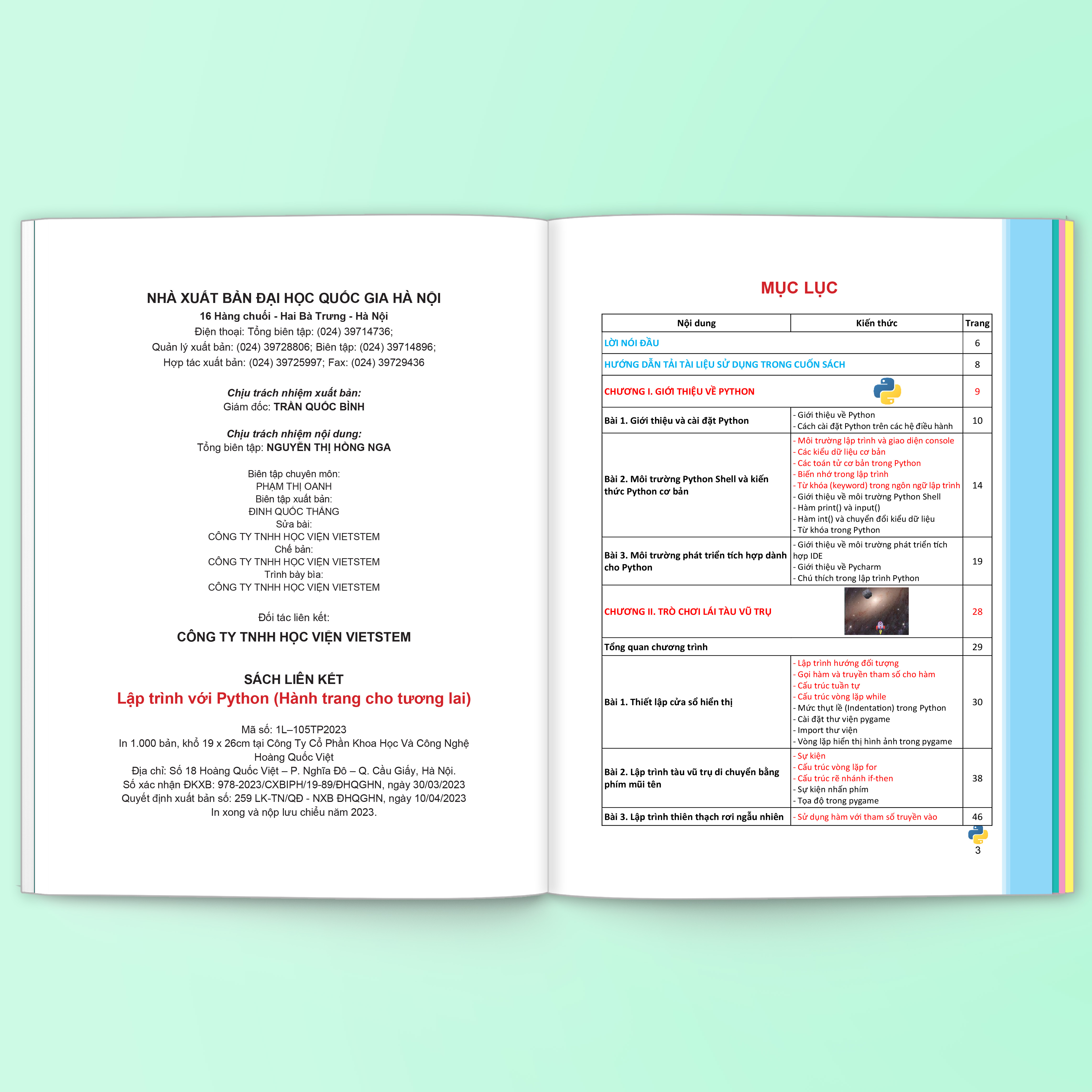 - Chương 2: Tìm hiểu lập trình đồ họa với thư viện Pygame và tạo ra trò chơi Lái tàu vũ trụ, qua đó cung cấp kiến thức cơ bản về lập trình như vòng lặp, sự kiện, cấu trúc rẽ nhánh…
