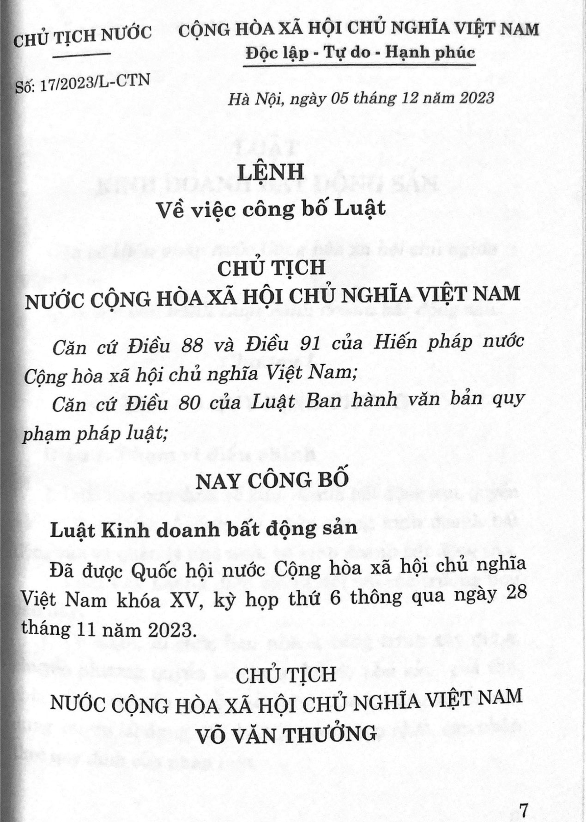 Ngày 28/11/2023 tại Kỳ họp thứ 6, Quốc hội khóa XV thông qua Luật Kinh doanh bất động sản 2023 gồm 10 Chương, 83 Điều. Luật chính thức có hiệu lực thi hành từ