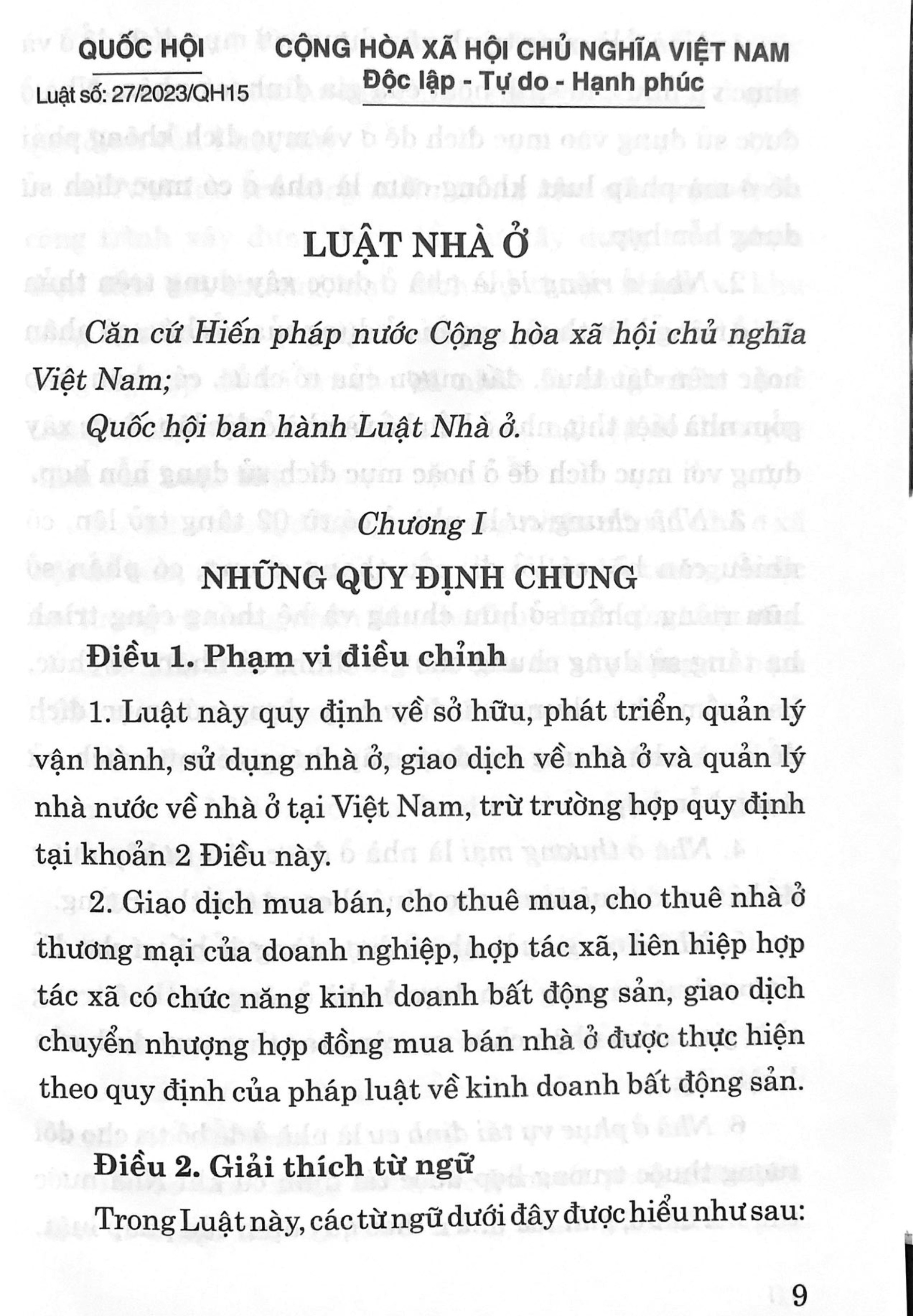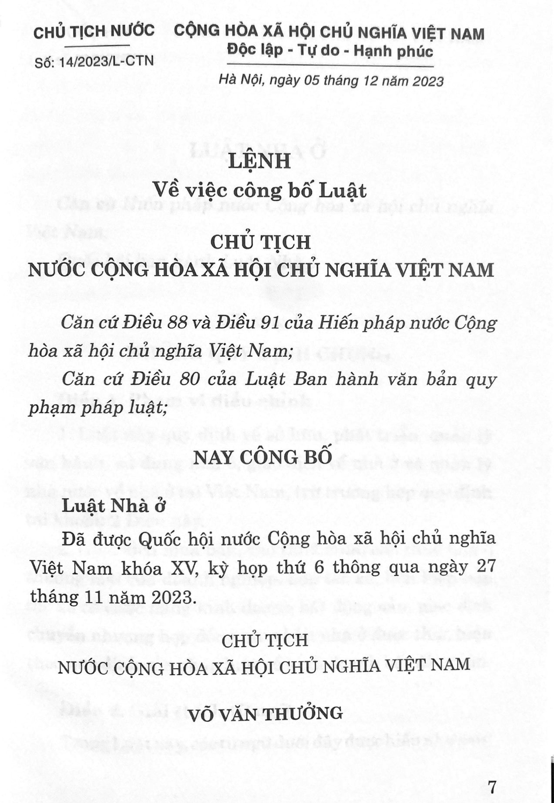 Luật Nhà ở năm 2023 được Quốc hội khóa XV thông qua tại kỳ họp thứ 6 ngày 27/11/2023 gồm 13 chương, 198 điều, điều chỉnh các vấn đề liên quan đến lĩnh vực nhà ở như: sở hữu nhà ở; chiến lược phát triển nhà ở quốc gia, chương trình, kế hoạch phát triển nhà ở cấp tỉnh; phát triển nhà ở; cải tạo, xây dựng lại nhà chung cư; chính sách về nhà ở xã hội; tài chính để phát triển nhà ở; quản lý, sử dụng nhà ở; quản lý, sử dụng nhà chung cư; giao dịch về nhà ở; quản lý nhà nước về nhà ở; giải quyết tranh chấp và xử lý vi phạm pháp luật về nhà ở.