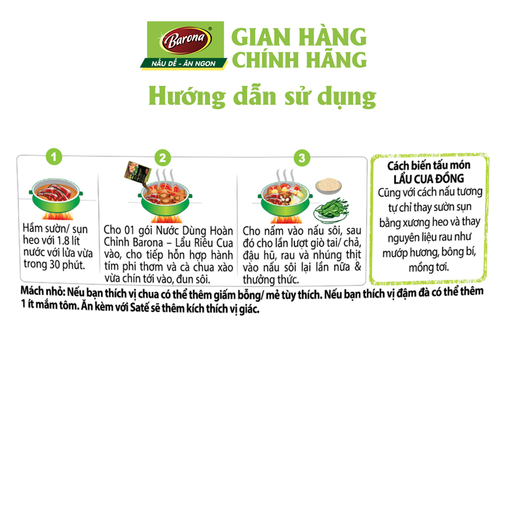 - 1 gói Nước Dùng Hoàn Chỉnh Barona – Lẩu Riêu Cua 230g.