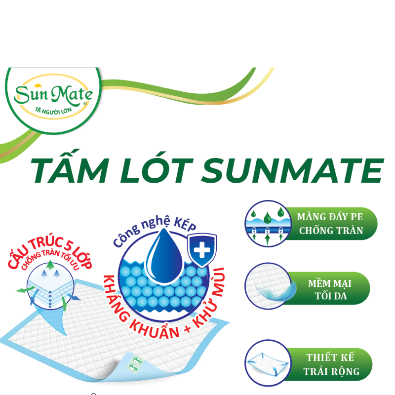 Combo 3 Tấm lót SunMate cải tiến mới (45 x 70cm) Giới thiệu Sản phẩm tấm lót SunMate dành cho cả nam và nữ, phù hợp với người hạn chế khả năng đi lại. Hạt gel tác động kép siêu thấm hút và kháng khuẩn hiệu quả cùng lớp dẫn thấm thông minh thấm hút nhanh, ngăn thấm ngược hiệu quả, giúp luôn khô thoáng, thoải mái cho người sử dụng. Tấm lót SunMate cải tiến mới với hai kích thước: 45cmx70cm và 60cmx70cm, giúp người dùng có nhiều sự lựa phù hợp với nhu cầu sử dụng. Với thiết kế mới, cấu trúc 5 lớp chống tràn tối ưu và 4 góc keo dán cố định, giúp người dùng thoải mái và an tâm hơn khi sử dụng. Sản phẩm an toàn, chất lượng cao, được sản xuất đạt tiêu chuẩn GMP và chứng nhận quản lý chất lượng quốc tế ISO 9001 Hạn sử dụng: 3 năm kể từ ngày sản xuất Chất liệu PP, PE, Hạt siêu thấm, polyme kết dính, bông cellulose, BOPP, vải không dệt trắng Đặc điểm nổi bật Lõi siêu thấm tác động kép với hạt siêu thấm – kháng khuẩn – khử mùi: Tăng khả năng thấm hút vượt trội, hạn chế sự phát triển của vi khuẩn và giảm thiểu mùi khó chịu. Rãnh thoáng khí: Rãnh tổ ong đa diện (kích thước 45cmx70cm) và rãnh kim cương (kích thước 60cmx70cm) Thiết kế trải rộng: Tối đa diện tích bề mặt, giúp người dùng thoải mái trong mọi cử động. Chống tràn tối ưu: Cấu trúc 5 lớp cùng màng đáy PE, chống tràn, ngăn ngừa tuyệt đối chất lỏng rò rỉ ra ngoài, giữ bề mặt luôn sạch sẽ. 4 góc khóa dán cố định: giúp định vị tấm lót, chống xê dịch trong quá trình sử dụng. Công dụng Tấm lót SunMate được dùng chăm sóc vệ sinh cho bệnh nhân sau mổ, bệnh nhân nằm lâu trên giường bệnh, phụ nữ sau sinh, người sử dụng tã cần hỗ trợ thêm, bảo vệ chống tràn và giữ vệ sinh giường, ghế, xe lăn…. Hướng dẫn sử dụng Trải phẳng tấm lót lên bề mặt giường, ghế… Giúp người sử dụng ngồi/nằm lên tấm lót, điều chỉnh tấm lót cho phù hợp Hướng dẫn bảo quản Bảo quản nơi khô ráo, thoáng mát: Tránh ánh nắng trực tiếp và nơi ẩm ướt. Để xa tầm tay trẻ em. Tiêu chuẩn an toàn Sản phẩm đã được kiểm nghiệm và cấp phép lưu hành, đảm bảo an toàn cho người sử dụng. Lưu ý sử dụng Thay tấm lót sau khoảng 3-4 tiếng sử dụng hoặc ngay sau khi tiêu bẩn để giữ cho người dùng luôn sạch sẽ Cuộn lại và bỏ vào thùng rác sau khi sử dụng, không tiêu hủy vào bồn cầu Khuyến cáo Tư vấn bác sĩ: Nếu bạn gặp phải bất kỳ vấn đề sức khỏe nào liên quan đến việc tiểu tiện, hãy tham khảo ý kiến bác sĩ. Không sử dụng lại miếng lót đã dùng. Bao bì Sản phẩm thay đổi tùy theo đợt hàng Thông tin thương hiệu: SunMate là một thương hiệu thuộc sở hữu của công ty Taisun Việt Nam là Công ty với hơn 20 năm chuyên sản xuất các sản phẩm chăm sóc người lớn tuổi, phụ nữ và trẻ em tại Việt Nam với những nguyên liệu an toàn từ các nhà cung cấp hàng đầu thế giới đến từ Mỹ, Thụy Điển, Đài Loan, …cùng dây chuyền sản xuất tiên tiến đạt tiêu chuẩn GMP, luôn đổi mới, phát triển những sản phẩm chất lượng cao với giá thành cạnh tranh đáp ứng nhu cầu của người tiêu dùng Việt Nam và xuất khẩu đến các thị trường như Đài Loan, Thái Lan, Mỹ, Châu Âu… Thông điệp từ Taisun: Để bảo vệ những người thân yêu của chúng ta và giữ môi trường sống của chúng ta lành mạnh. Taisun chúng tôi kiên định lộ trình chuyển đổi sản xuất sử dụng năng lượng xanh, hợp tác cùng các đối tác cung cấp nguyên liệu xanh. Cám ơn bạn đã lựa chọn sản phẩm của Taisun, cùng chúng tôi phát triển bền vững, bảo vệ môi trường sống của chúng ta.
