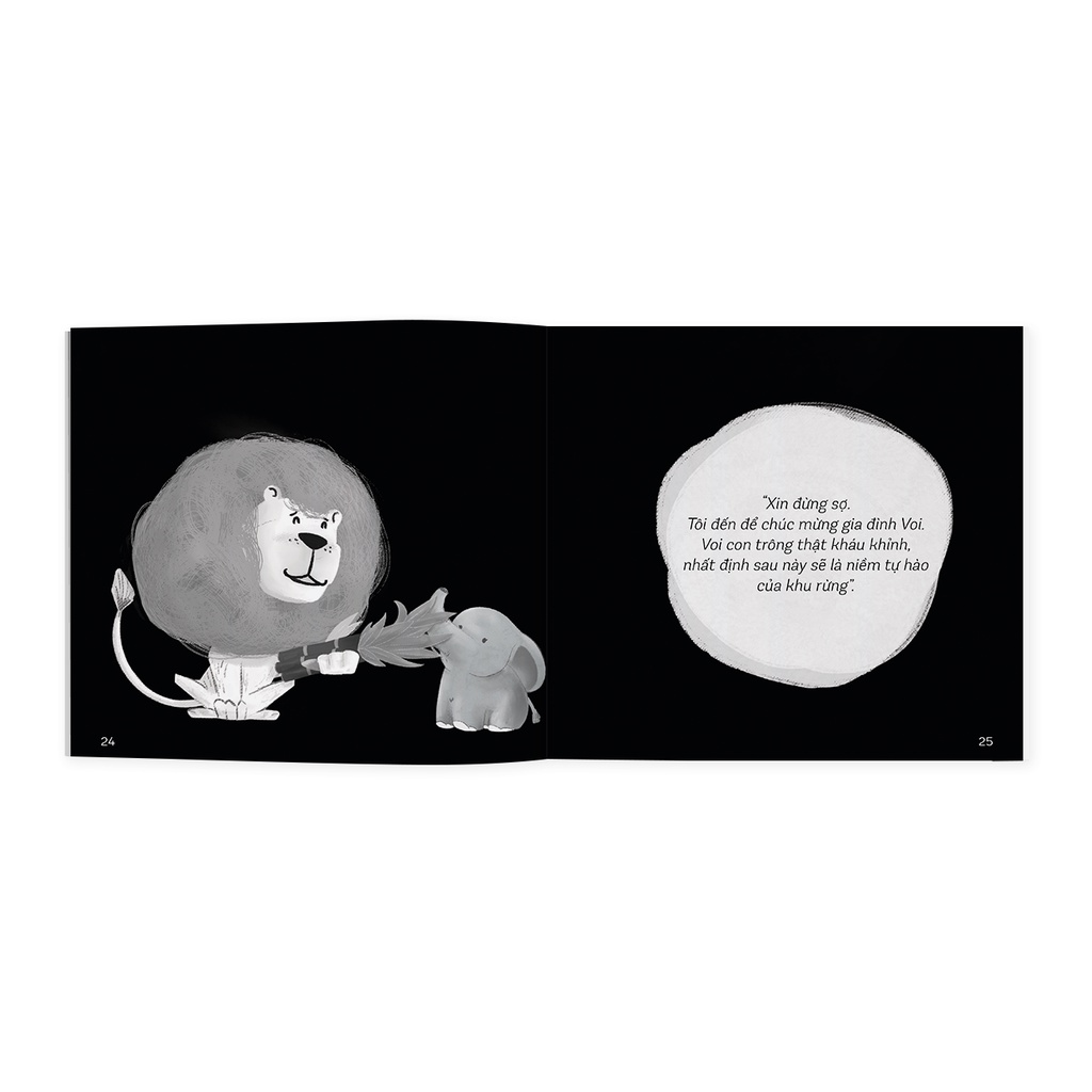 Voi con đến rồi: Gia đình Voi hạnh phúc đón đứa con đầu lòng và muốn chia sẻ niềm vui ấy đến tất cả mọi người trong khu rừng. Voi bố bèn dẫn theo Voi