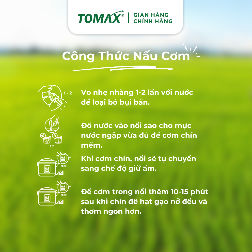 • Chất béo: 0.52 - 0.78% Xuất xứ: Nhà máy công ty cổ phần Gavi Đơn vị phân phối: Công Ty TNHH TOMAX Holding Khối lượng tịnh: Túi 5kg Hạn sử dụng: 12 tháng kể từ ngày sản xuất Bảo quản: Nơi khô ráo, tránh ánh nắng trực tiếp. Cảnh báo: Không sử dụng sản phẩm đã hết hạn sử dụng hoặc có dấu hiệu mốc. Bí quyết nấu Gạo Đài Thơm Tomax Bước 1: Vo gạo nhẹ nhàng với nước sạch 1-2 lần, sau đó cho vào nồi cơm điện. Bước 2: Đậy nắp và bật chế độ nấu. Khi cơm chín, nồi sẽ tự động chuyển sang chế độ giữ ấm. Ủ cơm thêm 10-15 phút để cơm chín đều và ngon hơn. Hãy chọn Gạo Đài Thơm Tomax để nấu bữa cơm dẻo thơm vừa miệng, hợp vị cả nhà và đong đầy hạnh phúc nhé!