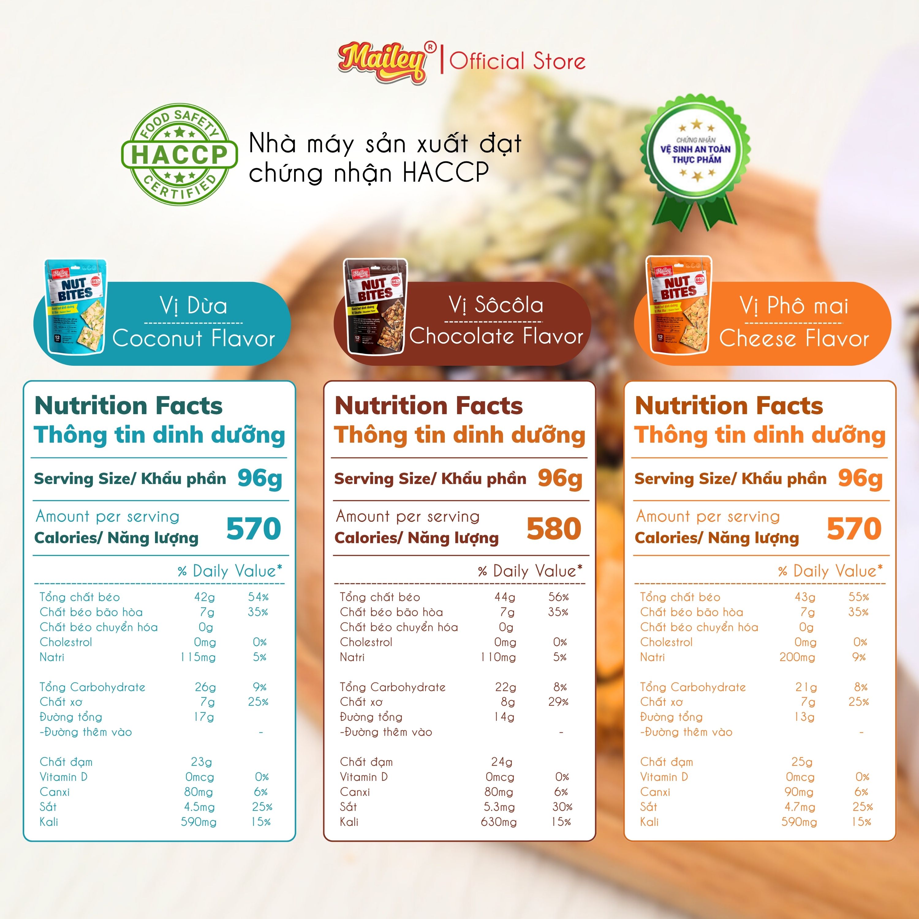Bánh hạt dinh dưỡng NUT BITES Mailey – ăn vặt ngon miệng, không lo lắng về sức khỏe   Dành cho người ăn kiêng, người theo chế độ eat clean, người bận rộn cần bữa phụ lành mạnh và tiện lợi. Bạn có thể ăn vặt mỗi ngày mà không cần lo lắng – vì bánh hạt Mailey được làm từ 100% thành phần tự nhiên, không đường tinh luyện, không chất bảo quản, không chiên dầu và chỉ ngọt nhẹ từ nguyên liệu tự nhiên. Giòn tan từ các loại hạt dinh dưỡng rang thơm, kết hợp cùng lớp phủ phô mai mặn mặn béo nhẹ, dừa ngọt dịu, hoặc sô cô la đậm đà, bánh hạt Mailee là món ăn vặt vừa ngon vừa tốt cho sức khỏe, hỗ trợ giữ dáng, no lâu mà không tăng cân. Phù hợp cho mọi độ tuổi: từ trẻ em, người lớn tuổi,dân văn phòng hay người tập gym, ăn chay   Thông tin chi tiết về sản phẩm: