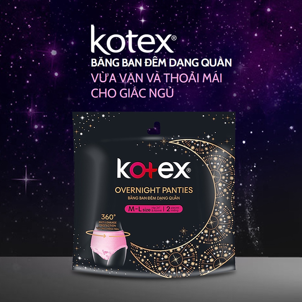 Băng ban đêm dạng quần đột phá MỚI với thiết kế vừa vặn và chống tràn 360 độ cho bạn cảm giác an toàn và thoải mái suốt đêm. THÔNG TIN SẢN PHẨM Kotex Băng