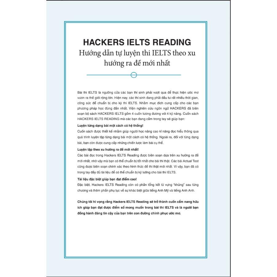 - Hackers IELTS Reading - Cuốn sách được thiết kế nhằm giúp người học nâng cao kỹ năng đọc hiểu thông qua quá trình luyện tập từng dạng bài một cách có hệ thống. Ngoài ra, đối với từng dạng bài, bạn còn được cung cấp những chiến lược làm bài cụ thể. Các bài đọc trong Hackers IELTS Reading được biên soạn dựa trên xu hướng ra đề mới nhất, nhờ vậy mà bạn có thể chuẩn bị tốt cho bài thi thật. Các bài Actual Test cũng được biên soạn chính xác theo hình thức đề thi thật mới nhất. Đặc biệt, Hackers IELTS Reading còn có phần tổng kết từ vựng "khủng" sau từng chương trình và thêm phần phụ lục về sự khác biệt giữa tiếng Anh Mỹ và tiếng Anh Anh.