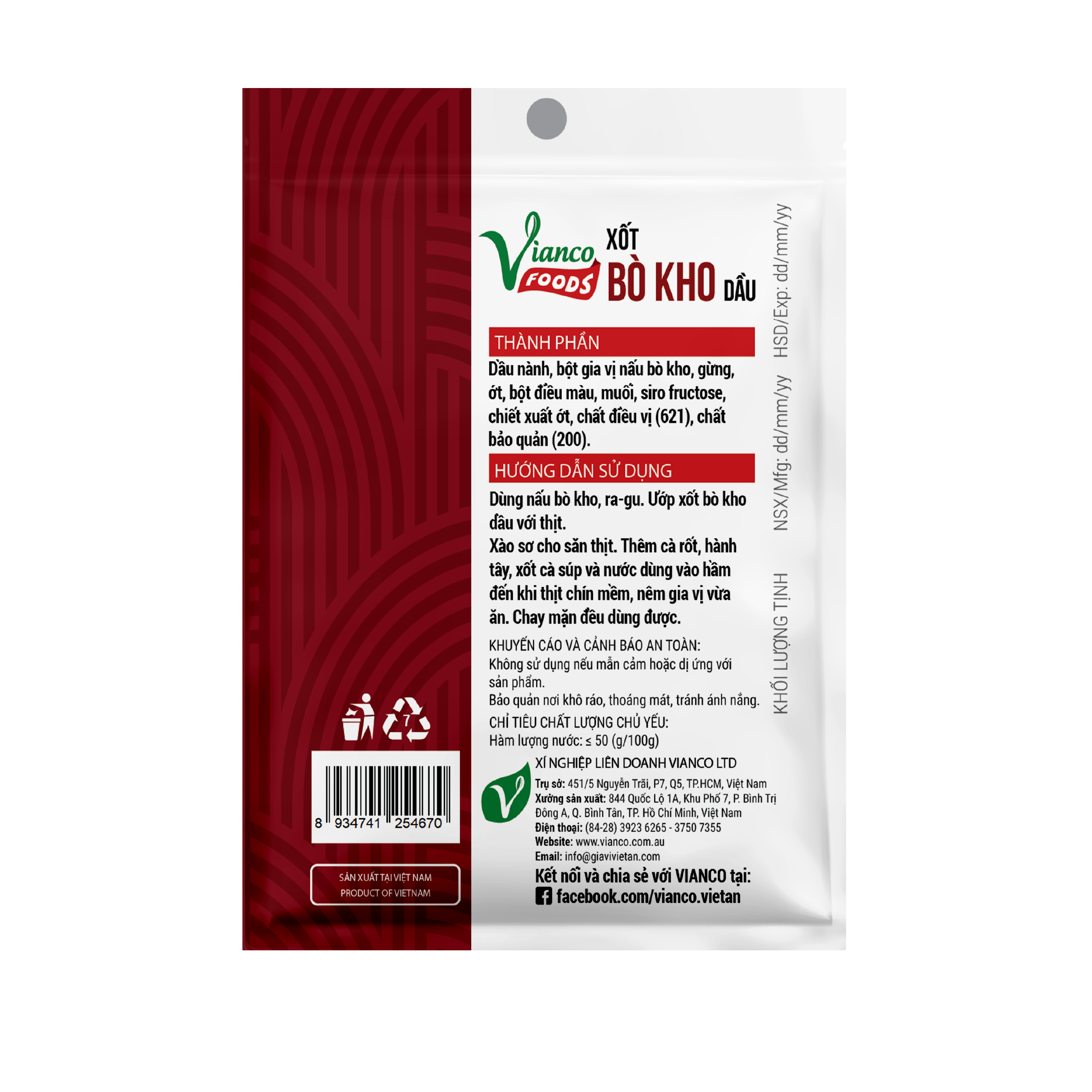 - Cách dùng: Thịt bò cắt khúc, ướp với gói Bột Bò Kho Vianco khoảng 30 phút. Xào 3-5 phút thịt bò đã được ướp với hành, tỏi, gừng, sả đập dập, cho 2 lít nước cùng với cà rốt, củ cải trắng, hành tây đều cắt khúc vào nấu chung đến khi thịt chín mềm. Sử dụng thêm gói Xốt Bò Kho ViancoFoods, cà súp vào nấu tiếp khoảng 15 phút, nêm gia vị muối, đường cho vừa ăn. Cho thêm hỗn hợp 1 muỗng bột năng đã hòa tan với nước vào nồi bò kho tạo độ đặc sệt, nấu đến khi sôi thì có thể tắt lửa.