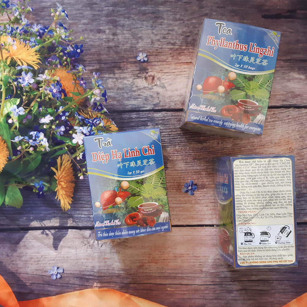 TRÀ DIỆP HẠ LINH CHI      Trà được chế biến từ cây Diệp Hạ Châu “phyllanthus SP”, dân gian ta còn gọi là “CHÓ ĐẺ RĂNG CƯA” được kết hợp với nấm Linh Chi là một thảo dược quý rất tốt cho sức khỏe, cùng với các thảo dược thiên nhiên khác làm thành trà, thay nước uống hằng ngày hỗ trợ và rất tốt cho người bị viên gan, viên gan siêu vi B, viên gan mãn tính, viên gan cấp, rối loạn chức năng gan do rượu – hóa chất, hạ cholesterol – gan nhiễm mỡ, mỡ trong máu, thông mật giải độc, thanh nhiệt, chống dị ứng, mụn nhọt …vv.     Diệp Hạ Linh Chi là trà thảo dược thiên nhiên uống lâu không có tác hại phụ, giúp cho da dẻ mịn màng bảo vệ và khôi phục chức năng gan, tăng cường bổ máu vào tạng gan, phục hồi cơ thể, tăng cường đề kháng, phòng chống ung thư, ăn ngủ ngon. Ngoài ra còn giúp thanh lọc cơ thể, chống  mệt mỏi, tăng cường sức khỏe làm sạch HbsAg.        THÀNH PHẦN: Diệp Hạ Châu 20%, Linh Chi 20%, Hạn Liên Thảo 10%, Nhân Trần 15%, Kỷ Tử    15%, Đương Quy 15%, Cam Thảo 5%. CÁCH DÙNG: Cho túi trà vào tách nước sôi 100oC đậy kín khoảng 3-4 phút là dùng được. Ngày uống từ 4 đến 6 gói có thể cho trực tiếp vào bình thủy uống trong ngày  ( loại trà này nên dùng khi nước trà còn nóng hoặc ấm thì tốt hơn). BẢO QUẢN: Vì không sử dụng hóa chất bảo quản nên để hộp trà nơi khô ráo, thoáng sạch. SẢN XUẤT TẠI: DNTT Trà Thảo Dược Nguyên Thái Trang 01 Phan Đình Phùng, Phường 1, Tp. Đà Lạt, Lâm Đồng HẠN SỬ DỤNG: