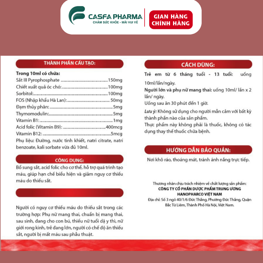 THÀNH PHẦN: Sắt III polymaltose 150mg, Imunecanmix 10mg, Vitamin B6 3.5mg, Acid folic 600mcg CÔNG DỤNG: Bổ sung sắt, acid folic cho cơ thể Hỗ trợ tái tạo hồng cầu và giảm tình trạng thiếu