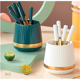 Mua tại TiktokCombo 6 Thìa 6 Nĩa inox hoàng kim cán sứ kèm cốc sứ đựng kẻ vàng kim cao cấp | Hũ sứ xanh trắng kẻ vàng kèm thìa nĩa sứ