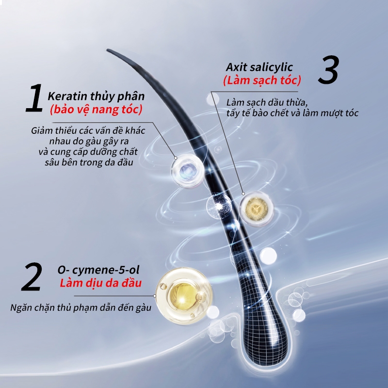 Giúp loại bỏ gàu ngay từ lần gội đầu tiên Làm dịu da đầu nhạy cảm, giảm ngứa và khô Phục hồi tóc yếu, xơ, chẻ ngọn Cân bằng độ pH và dầu trên da