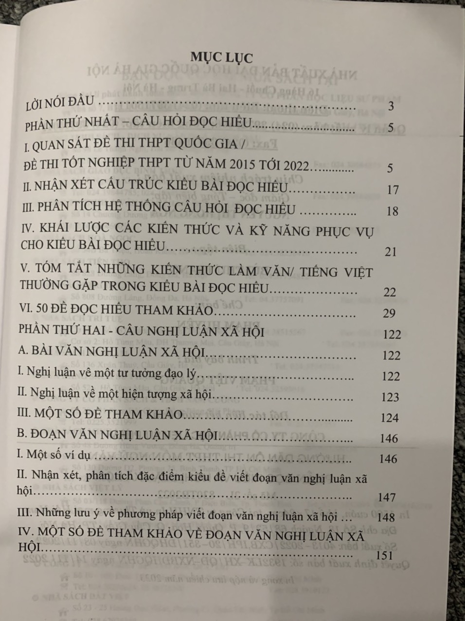 Phần thứ nhất: Câu hỏi đọc hiểu I. Quan sát đề thi THPT quốc gia/ Đề thi tốt nghiệp THPT từ năm 2015 tới 2022 II. Nhận xét cấu trúc kiểu bài đọc hiểu III. Phân tích hệ thống câu hỏi đọc hiểu IV. Khái lược các kiến thức và kỹ năng phục vụ cho kiểu bài đọc hiểu V. Tóm tắt những kiến thức làm văn / Tiếng Việt thường gặp trong kiểu bài đọc hiểu VI. 50 Đề đọc hiểu tham khảo Phần thứ hai: Câu nghị luận xã hội A. Bài văn nghị luận xã hội I. Nghị luận về một tư tưởng đạo lý II. Nghị luận về một hiện tượng xã hội III. Một số đề tham khảo B. Đoạn văn nghị luận xã hội I. Một số ví dụ II. Nhận xét, phân tích đặc điểm kiểu đề viết đoạn văn nghị luận xã hội III. Những lưu ý về phương pháp viết đoạn văn nghị luận xã hội IV. Một số đề tham khảo về đoạn văn nghị luận xã hội Tác giả: Trịnh Thu Tuyết Số trang: 183 Xuất bản: 2023 Nhà xuất bản: Đại học quốc gia Hà Nội Công ty phát hành: Công ty cổ phần Học liệu sư phạm