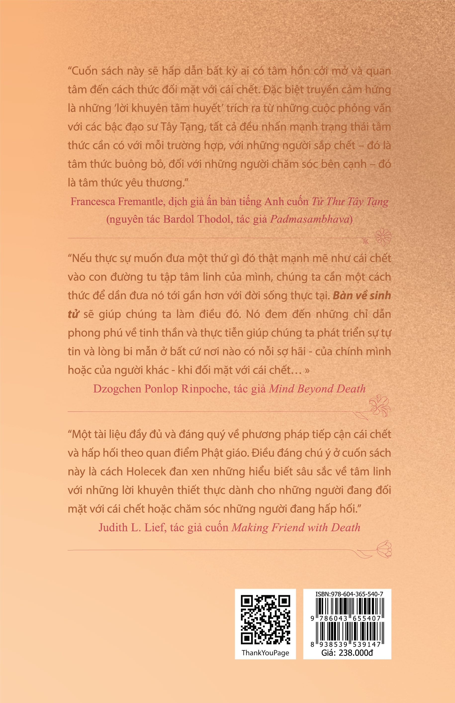 Câu trả lời thật kinh ngạc, nhưng đồng thời cũng khơi gợi trong chúng tôi một loạt những câu hỏi: Làm sao có thể thực chứng được điều này? Làm sao có thể ứng dụng điều này để giúp mình và giúp người hiệu quả nhất? Có những cách nào để giúp mình và giúp người khi chết? Và cách nào là tốt nhất? Những câu hỏi đó đã thôi thúc chúng tôi tiếp tục hành trình tìm kiếm câu trả lời, cuộc hành trình đã đưa chúng tôi tới gặp rất nhiều người thầy, người bạn, và những cuốn sá Trong số những tài liệu mà chúng tôi hiện biết, Bàn Về Sinh Tử là một tác phẩm đặc biệt, một cẩm nang tham khảo tổng thể về các vấn đề liên quan đến việc có một cái chết an lành, và do đó là một cuộc sống an lành, đối với bất cứ ai thực sự quan tâm đến việc khám phá những chiều sâu ý nghĩa của sự sống ẩn tàng nơi những dạng hình đối nghịch như sinh và tử. Bàn về từng vấn đề liên quan đến sinh-tử thì hiện cũng đã có nhiều tác phẩm rất sâu sắc, nhưng bàn một cách tổng thể về các vấn đề liên quan đến sinh-tử như tác phẩm này thì hiện chúng tôi rất ít thấy. Với tính chất như vậy, chúng tôi đã không ngại khả năng còn hạn chế mà cố gắng chuyển dịch tác phẩm này ra tiếng Việt, khởi đầu chỉ như một hoạt động cùng học tập, sau đó nhờ sự hỗ trợ của các anh chị em Công ty TNHH Xuất Bản Thiện Tri Thức mà dịch phẩm này mới được thành hình như dạng thức hiện thời. Xin cảm tạ anh chị em và bày tỏ lòng biết ơn vô tận tới lớp lớp thế hệ các đạo sư, hành giả, học giả đã dâng hiến cuộc đời cho dòng chảy bất tận không ngừng của sự sống! Xin tha thứ cho tất cả những lỗi lầm có thể có của bản dịch! Và nguyện mong tác phẩm này sẽ mang đến điều lợi ích cho tất cả mọi sinh loài!