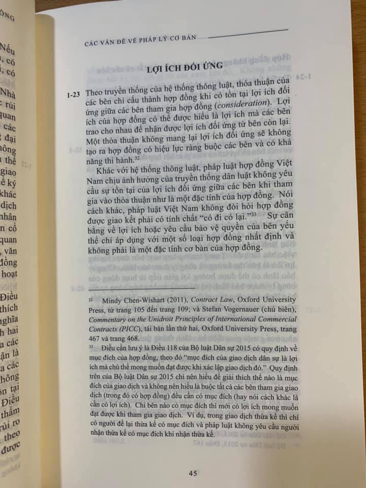 - Pháp Luật Về Hợp Đồng Các Vấn Đề Pháp Lý Cơ Bản (tái bản lần 1, 2024) LS. Trương Nhật Quang Năm xuất bản 2024 Phiên bản 2st Edition Loại bìa Bìa mềm Số trang 900 ISBN: 9786044026060 Nhà phát hành : NXB Dân Trí Giá bìa: 800.000 đ Nội dung sách: Đây là cuốn sách đầy đủ nhất liên quan đến pháp luật về hợp đồng. Trải dài trong gần 900 trang, cuốn sách phân tích các vấn đề liên quan đến (i) giao kết hợp đồng; (ii) hiệu lực hợp đồng; (iii) nội dung hợp đồng; (iv) vi phạm hợp đồng và biện pháp khắc phục; (v) miễn trừ trách nhiệm; (vi) chuyển giao quyền và nghĩa vụ; (vii) quyền của bên thứ ba trong hợp đồng vì lợi ích của bên thứ ba; và (viii) nguyên tắc chọn pháp luật áp dụng và cơ quan giải quyết tranh chấp hợp đồng. Đây là cuốn sách duy nhất trình bày các vấn đề liên quan đến pháp luật về hợp đồng cả từ góc độ lý thuyết và thực tế. Ngoài việc phân tích các quy định của các văn bản pháp luật, cuốn sách cũng phân tích các án lệ và bản án. Đây là cuốn sách giúp các luật sư hành nghề có thể tham khảo khi tư vấn trong các giao dịch thương mại có yếu tố nước ngoài. Cuốn sách tập trung phân tích phạm vi mà các bên có thể thỏa thuận trong hợp đồng để phân bố rủi ro. Đây là cuốn sách duy nhất có hệ thống tra cứu đầy đủ giúp người đọc tiện tra cứu. Cuốn sách có (i) bảng tra cứu từ khóa; (ii) bảng tra cứu án lệ, bản án và quyết định; và (iii) danh sách các tài liệu trích dẫn.