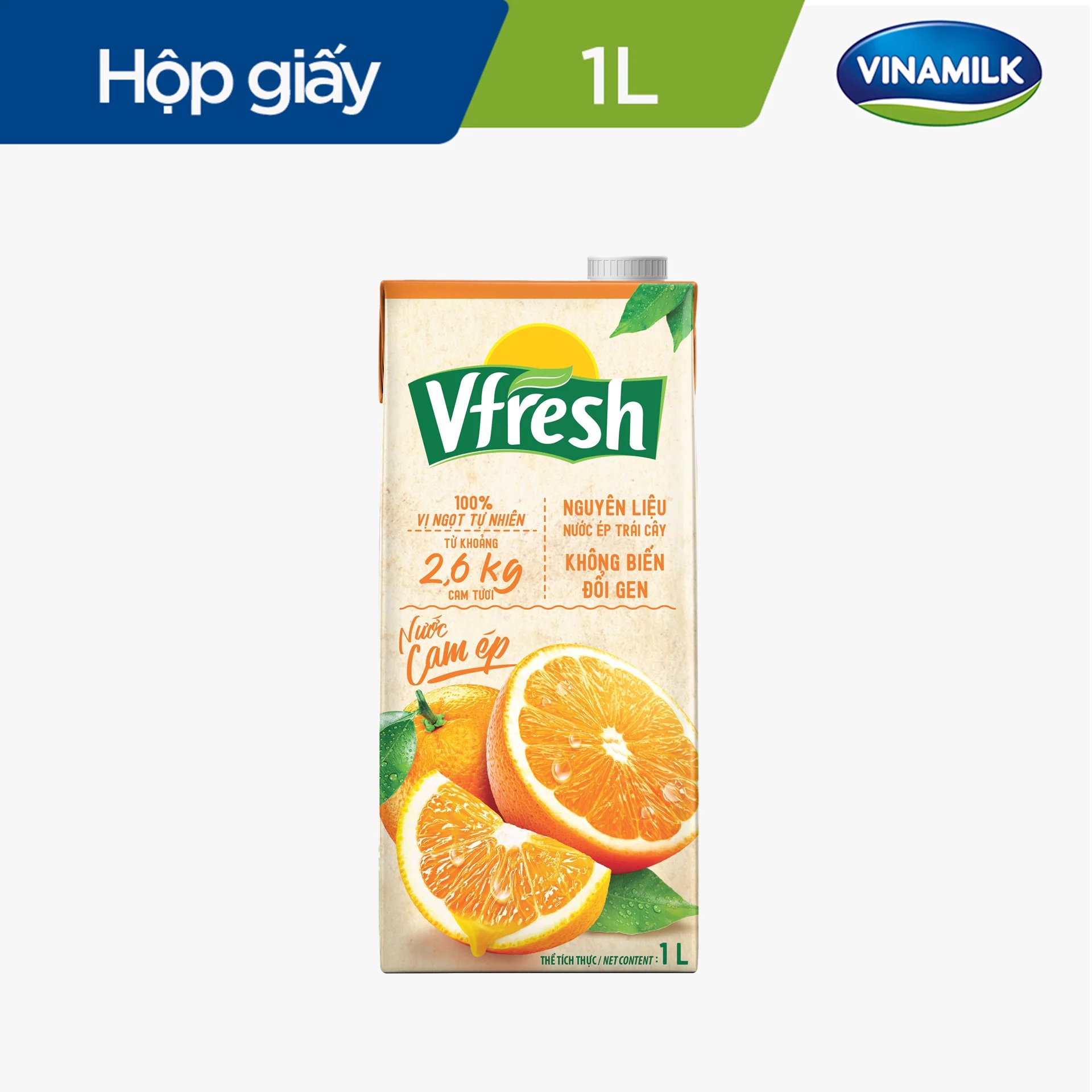 Nước cam Vfresh được thiết kế hộp tiện dụng, vỏ hộp làm bằng giấy tráng nhôm, bảo quản nước ép luôn giữ được hương vị tự nhiên thơm ngon, đem lại sự yên tâm cho người sử dụng.