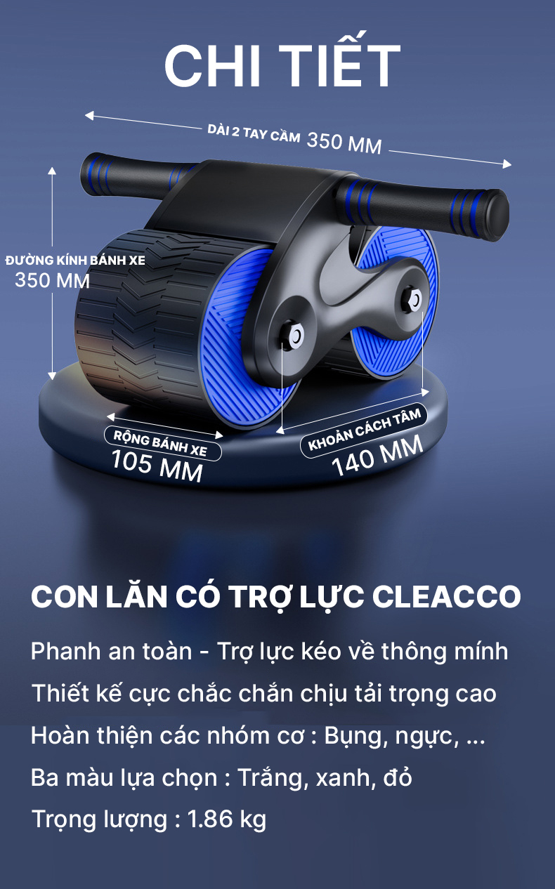 Các thông số kỹ thuật: Con lăn tập bụng 2 bánh cải tiến gấp gọn - Dụng cụ tập bụng : Bánh xe gấp mới cải tiến – gấp gọn dễ dàng mang theo - Khối lượng