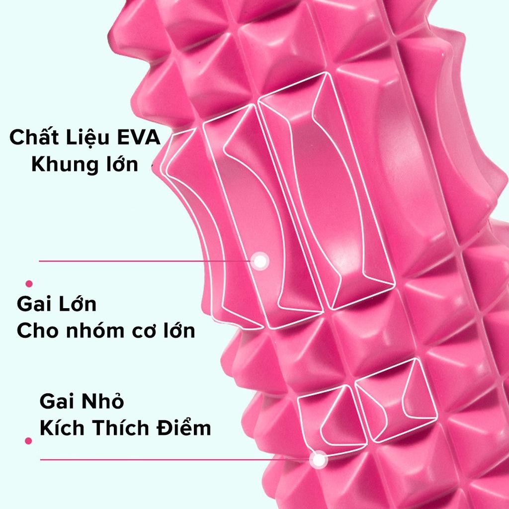 Con lăn yoga massage foam roller được làm từ chất liệu xốp nén cao cấp EVA siêu bền, có thiết kế gờ và rãnh massage mềm giúp ngăn ngừa chấn thương và tạo cảm giác thoải mái khi tập luyện.