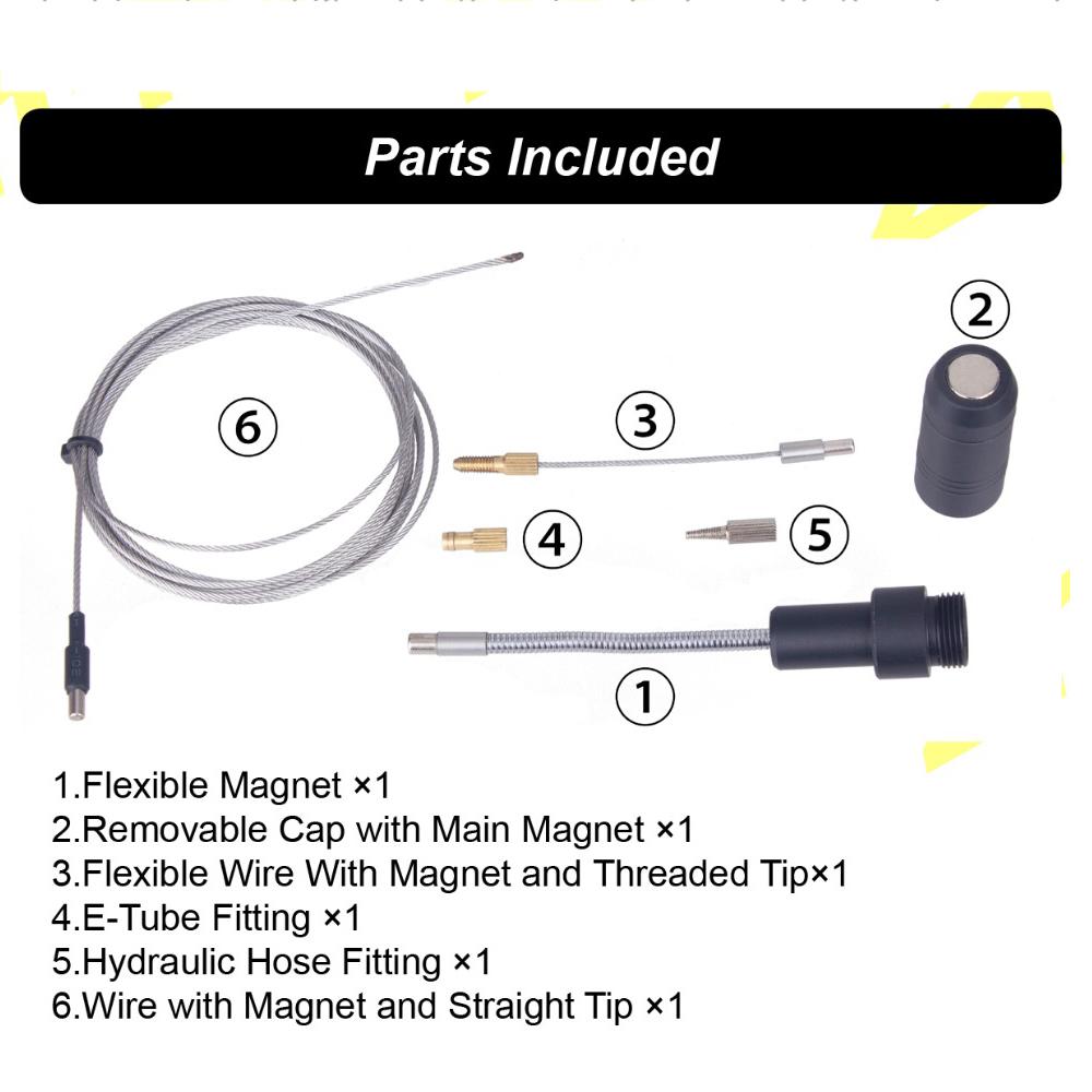 Packing List: 1 Flexible Magnet 1 Removable Cap with Main Magnet 1 Flexible Wire with Magnet and Threaded Tip 1 E-Tube Fitting 1 Hydraulic Hose Fitting 1 Wire with Magnet and Straight Tip