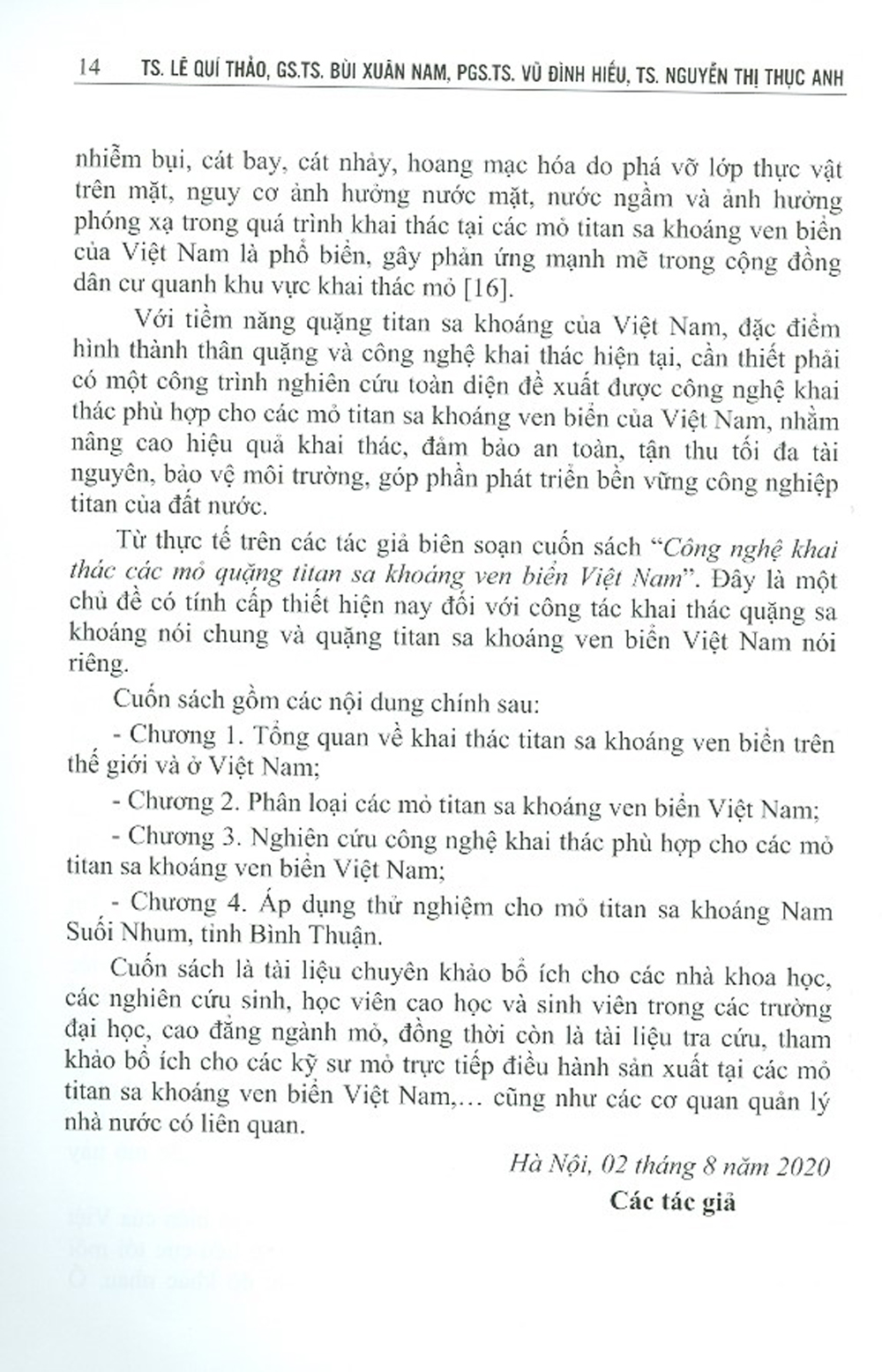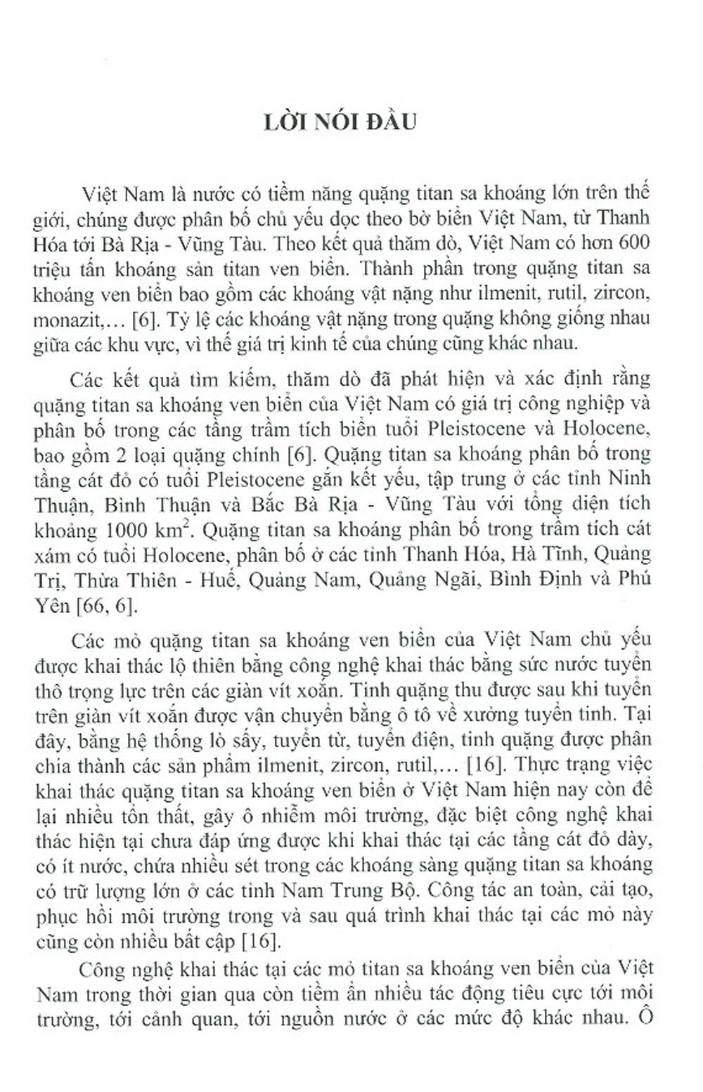 Nội dung bao gồm: Tổng quan về khai thác titan sa khoáng ven biển trên thế giới và ở Việt Nam; Phân loại, nghiên cứu công nghệ khai thác phù hợp cho các mỏ titan sa khoáng ven biển Việt Nam; Áp dụng thử nghiệm cho mỏ titan sa khoáng Nam Suối Nhum, tỉnh Bình Thuận.