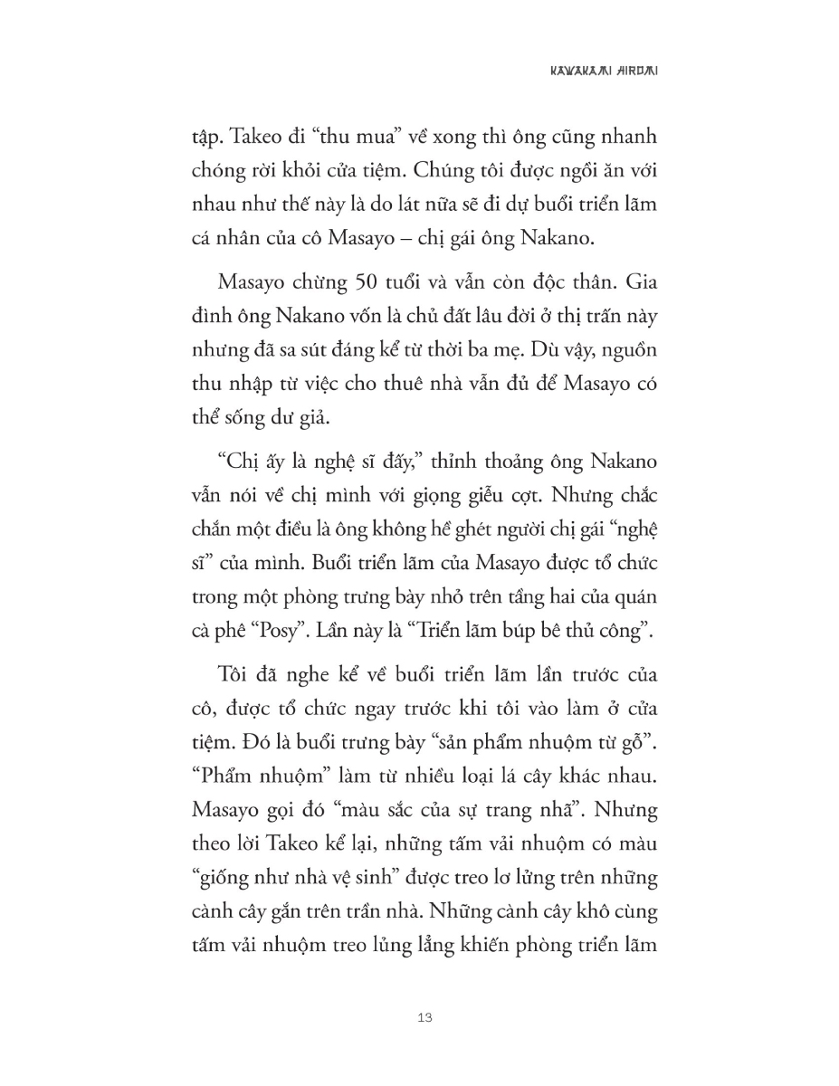 Cửa Tiệm Đồ Cũ Nakano của Kawakami Hiromi là một cuốn tiểu thuyết đầy màu sắc, khai thác sâu sắc những bí mật và tâm tư của con người thông qua bối cảnh một cửa tiệm đồ cũ. Những đồ vật được bán tại đây tuy trông bình thường, nhưng đều mang trong mình những dấu hiệu của niềm vui, nỗi đau và những bí ẩn sâu xa. Nhân viên và khách hàng của tiệm cũng không ngoại lệ, mỗi người đều mang theo những câu chuyện riêng, tạo nên một bức tranh sinh động và phức tạp về cuộc sống.