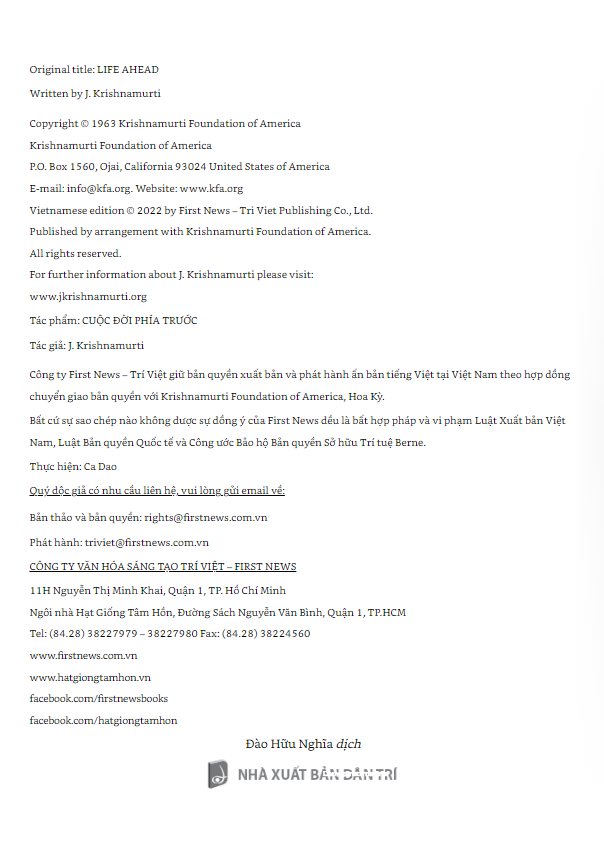 Không giáo điều hay khuyên răn, “Cuộc đời phía trước” được trình bày dưới dạng một cuộc thảo luận giữa thầy và trò, với văn phong mộc mạc nhưng đầy súc tích vốn quen thuộc của Krishnamurti, khơi gợi nhiều vấn đề mà các nhà giáo dục, những người thầy và cả các bậc phụ huynh có lẽ sẽ muốn chiêm nghiệm thêm về cách dạy và học hiện nay.