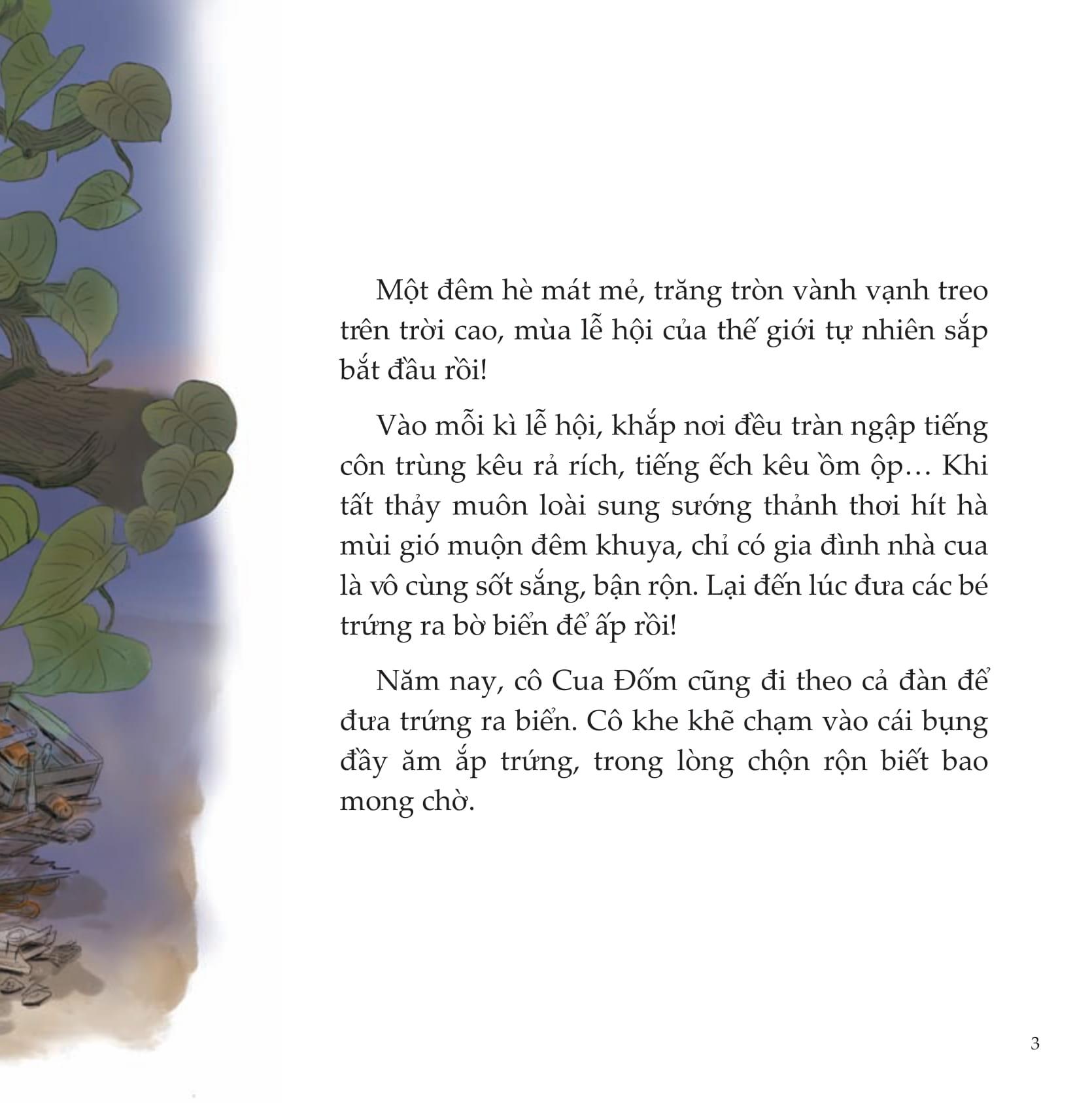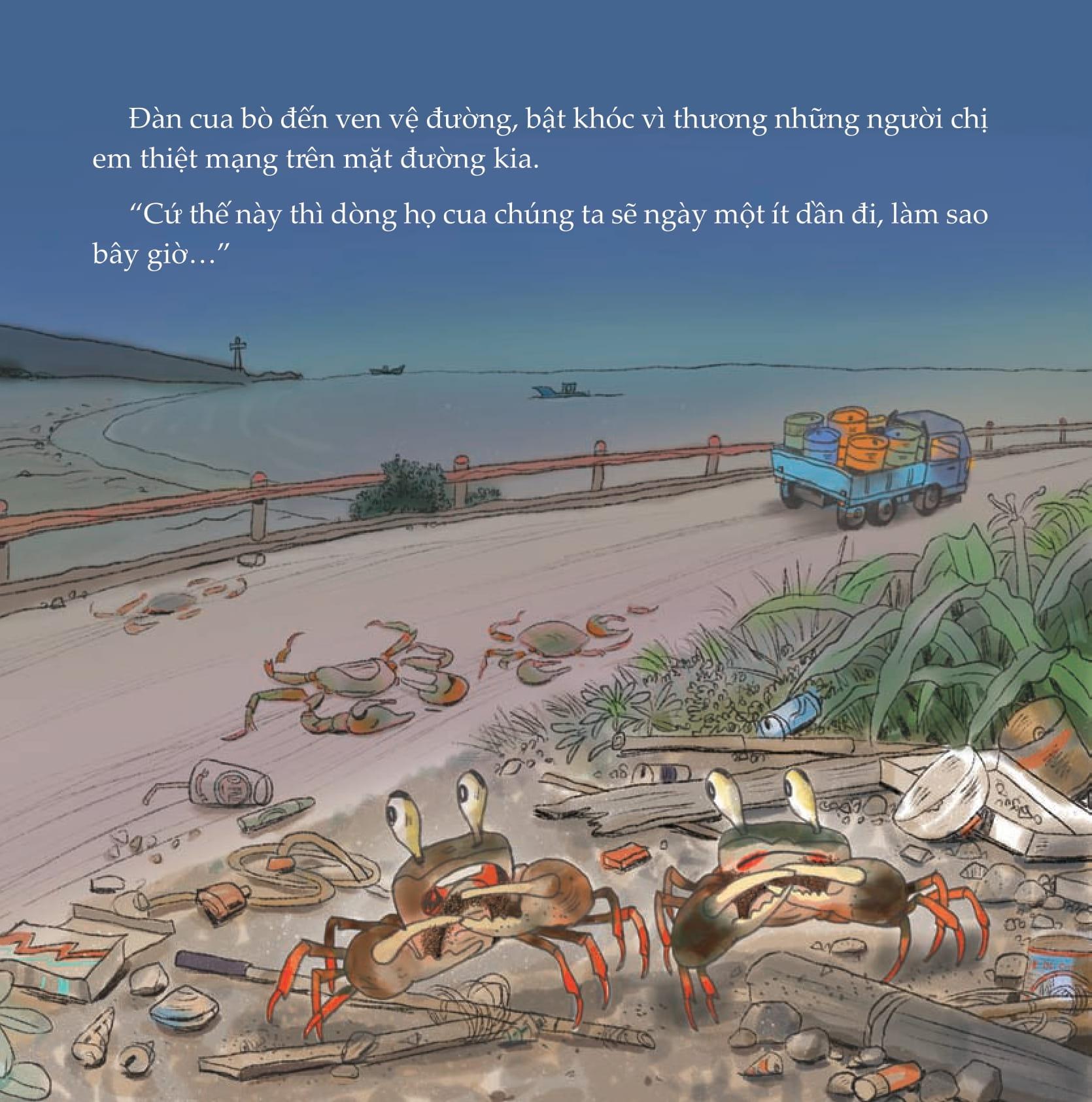 Nhưng muốn ra đến đó, họ nhà cua phải vượt qua con đường lớn đầy xe cộ qua lại. Cô Cua Đốm suýt bị xe đè phải kìa, nguy hiểm quá!