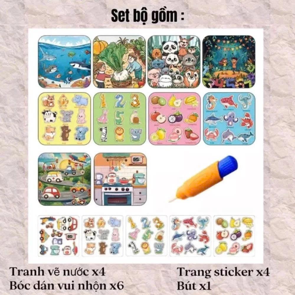 Cuốn sổ ma thuật bóc dán vẽ tranh bằng nước thông minh cho bé phát triển tư duy trí não Chức năng vẽ tranh nước: Bộ sản phẩm đi kèm 4 trang tranh vẽ nước