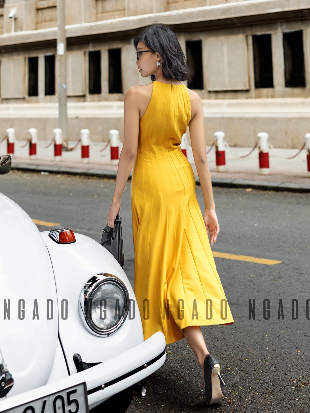 ✨Đầm vàng cổ yếm NGADO, Đầm xòe hở vai, Đầm dự tiệc, Đầm dạo phố