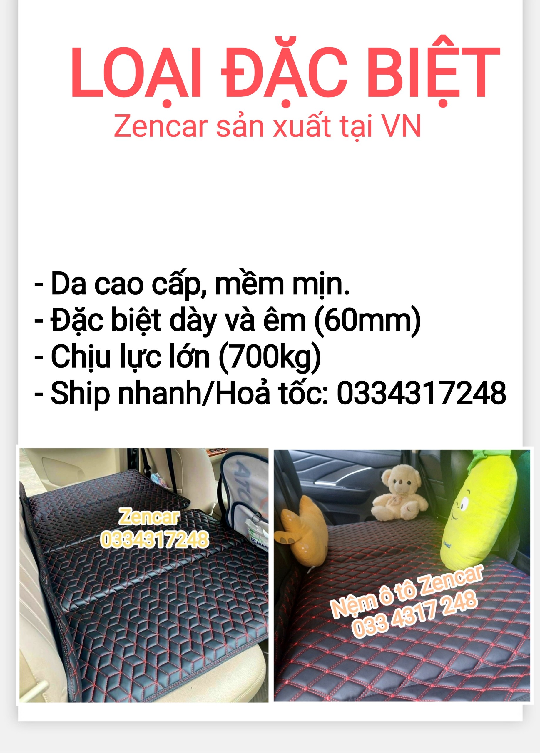 - Bảo hành 2 năm, nhận GIA CÔNG RIÊNG theo yêu cầu khách. CÁCH LẮP ĐẶT: - Trải nệm lên hàng ghế sau - treo 2 dây đai lên 2 ghế phía trước, thắt khóa điều chỉnh độ dài dây đai phù hợp với xe. Nệm là mặt phẳng được cố định chắc chắn, chịu lực 500kg. - Gấp gọn làm 4 khi không sử dụng. - Đặc điểm: Đệm ô tô ghế sau gấp gọn này chịu tải lên tới 500kg, không như các dòng nệm xe hơi ô tô khác, sản phẩm này sử dụng trực tiếp không cần bơm hơi, là một chiếc đệm ô tô ghế sau gấp gon thoải mái để trong cốp sau xe không tốn nhiều diện tích. - Thích hợp cho tất cả các dòng xe như một chiếc giường ngủ ô tô di động, đệm nằm sau xe ô tô tiện lợi LƯU Ý SỬ DỤNG: + Có thể làm đệm ô tô ghế sau như một chiếc giường ngủ ô tô ngả lưng êm ái, tạo ra không gian thoải mái cho trẻ nhỏ trên ô tô, giúp gia đình có một chuyến đi thoải mái, đặc biệt cần thiết trong những chuyến hành trình dài. + Có thể làm đệm để ngồi nghỉ khi đi dã ngoại, du lịch, tuy là đệm da nhưng sự êm ái không kém gì các loại nệm xe hơi ô tô thông thường. + Có khả năng chịu nước nhẹ, lau chùi dễ dàng, đệm nằm sau xe ô tô tiện dụng đa năng. - Đệm ô tô ghế sau được làm từ nhiều lớp vật liệu mềm, nhẹ, đàn hồi tốt, chịu được trọng lượng lớn, được bọc lớp mặt giả da siêu mịn tạo cảm giác vô cùng êm ái, dễ chịu. Nệm xe hơi loại cao cấp - Hơn hẳn các loại đệm hơi ô tô khác, chất lượng chiếc giường ngủ ô tô này cực kì đảm bảo, giá gốc cạnh tranh.