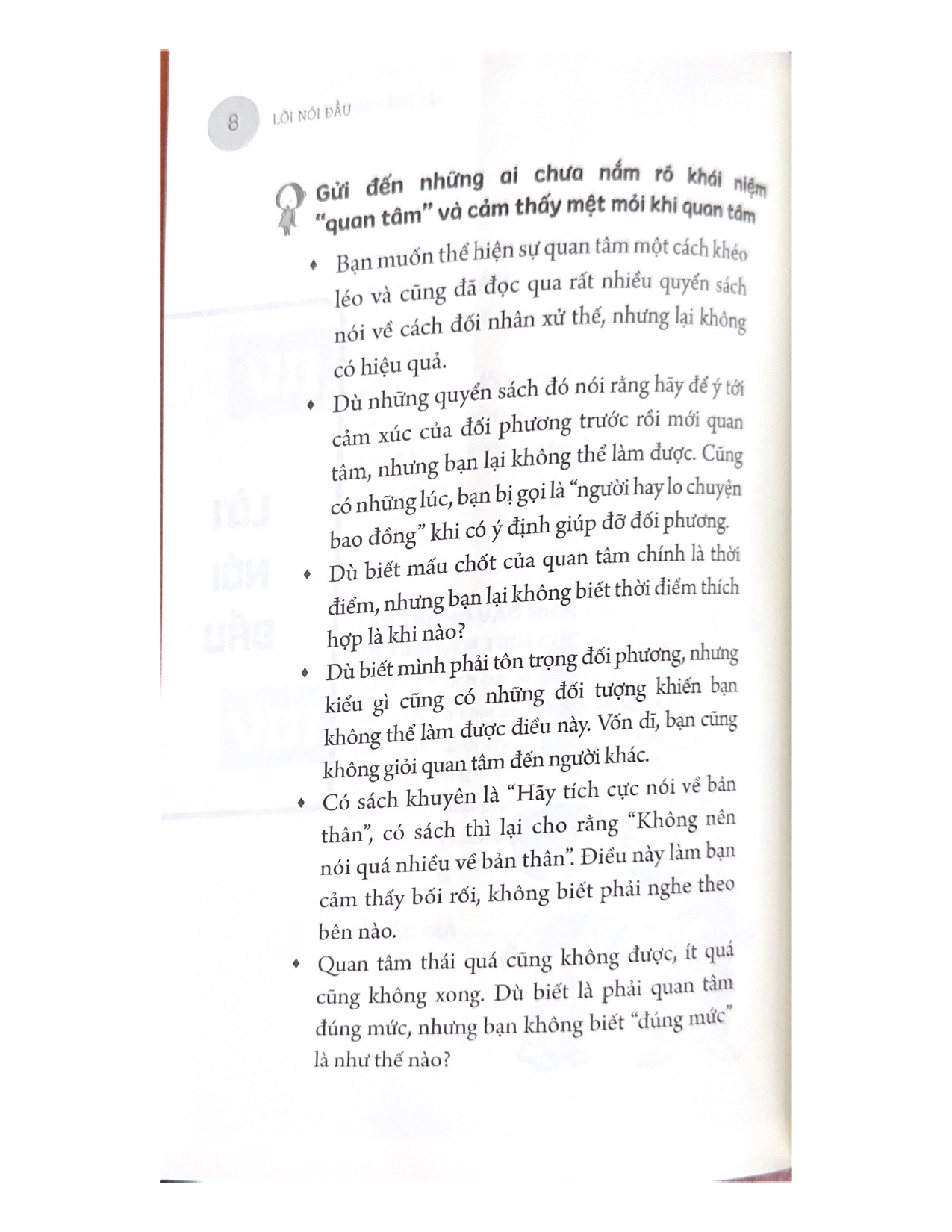 - Giới thiệu Hằng ngày, có rất nhiều người cảm thấy mệt mỏi và khổ sở vì gặp phải các vấn đề trong giao tiếp. Một số người không biết cư xử thế nào để gây thiện cảm với đối phương, số khác thì luôn quan tâm người khác hơn chính mình và chấp nhận chịu thiệt thòi trong các mối quan hệ. Bạn có muốn tìm hiểu về bí quyết ĐẮC NHÂN TÂM bằng lòng quan tâm của người Nhật để giúp mọi người xung quanh đều vui vẻ, bản thân cũng được chữa lành? Quan tâm đúng cách không chỉ đơn thuần là phương pháp giúp cải thiện các mối quan hệ xã hội, mà còn là thái độ quan trọng quyết định chất lượng cuộc sống của bạn. Thông qua những tình huống cụ thể và hình ảnh minh họa sinh động, ĐẮC NHÂN TÂM KIỂU NHẬT sẽ giúp bạn hiểu rõ hơn về khái niệm “quan tâm”, biết cách ứng xử và giao tiếp tích cực để xây dựng cuộc sống thoải mái, trọn vẹn hơn.