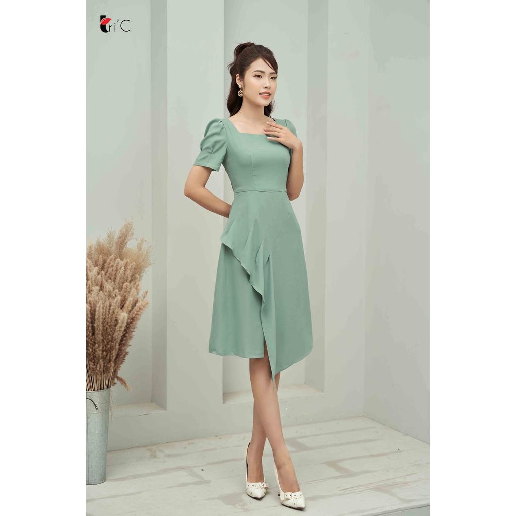 ✨Đầm A cổ vuông, tay bồng, bèo lệch Tri'C Luxury A22621 Xanh mint