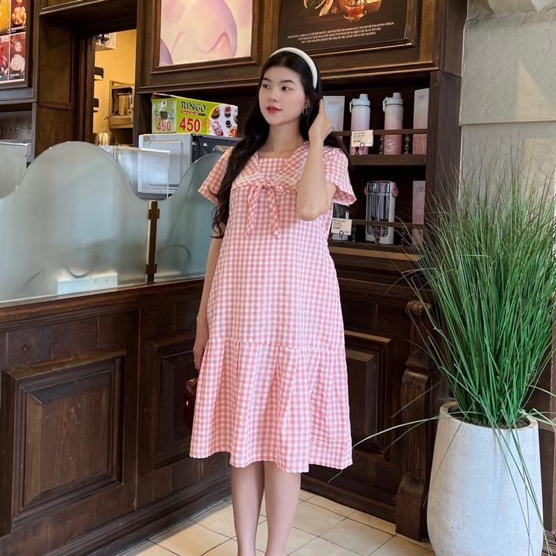 ÔNG TIN SẢN PHẨM: Mẫu đầm bầu karo dáng suông, thiết kế cổ sen nhún bèo, phối thắt nơ, dễ thương, năng động. Chất vải kate Hàn, mặc nhẹ mát không nóng bí, thấm hút