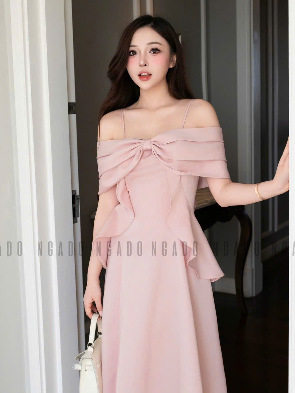 ✨Đầm hồng 2 dây trễ vai NGADO , đầm dài , đầm dự tiệc