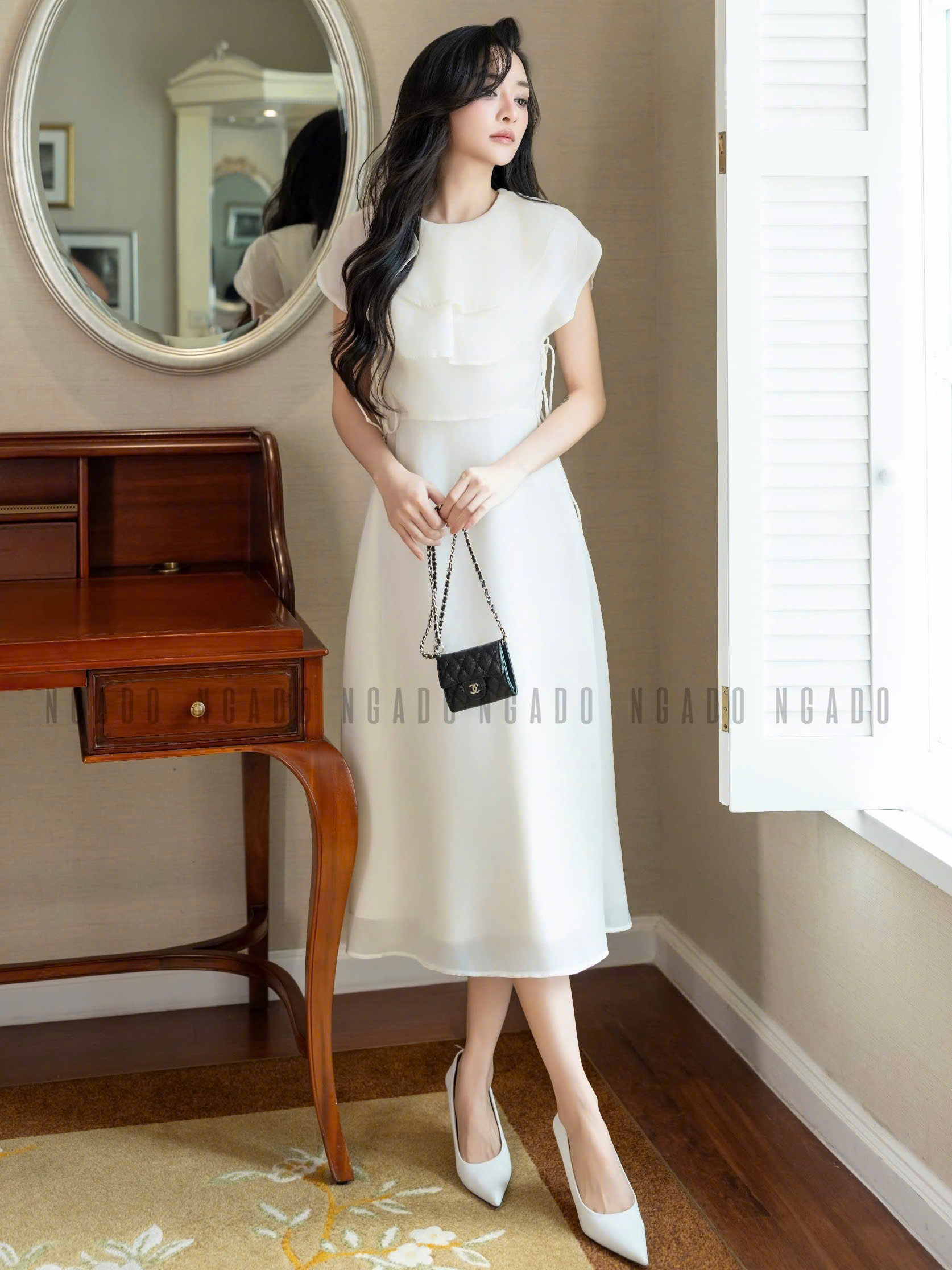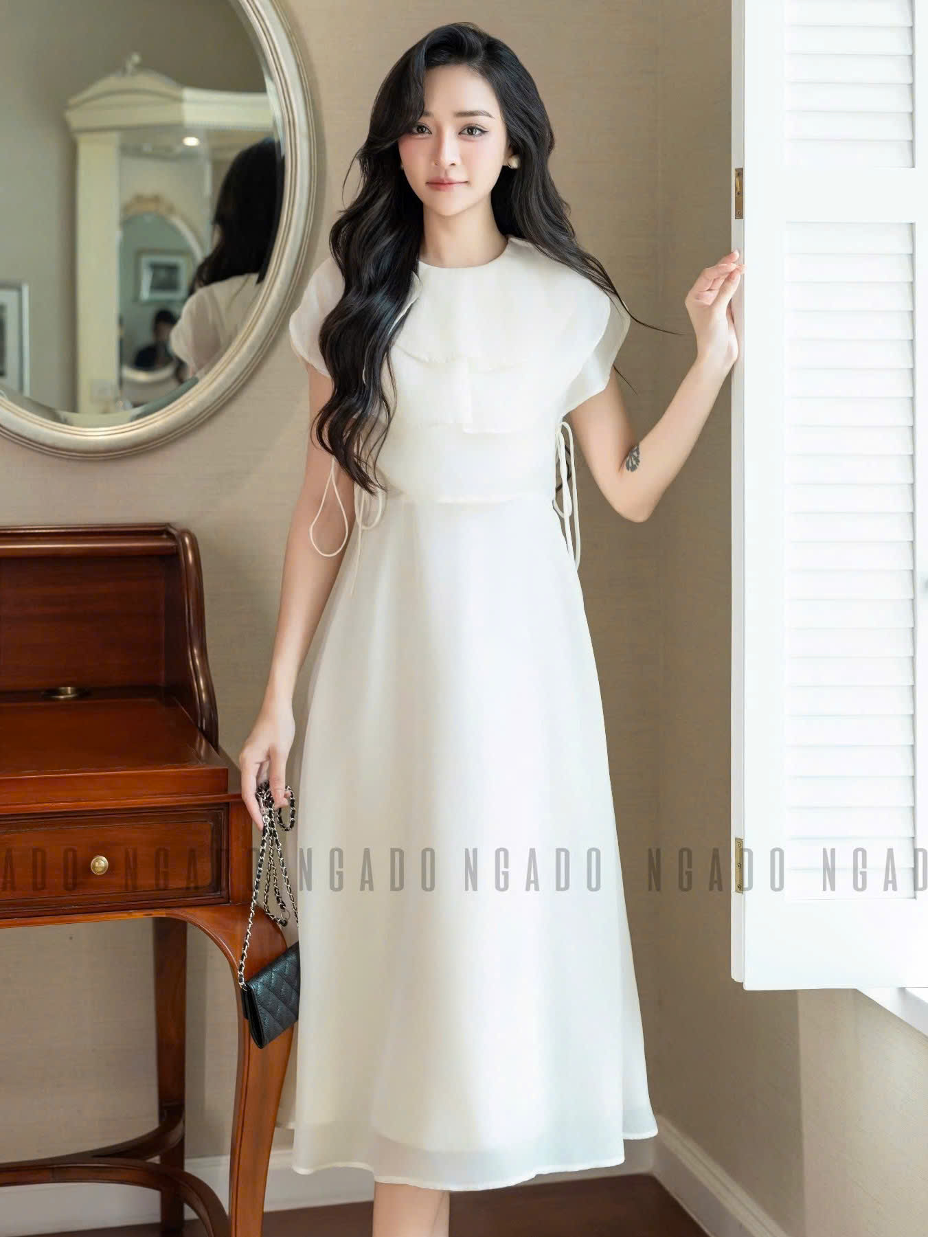 ✨Đầm kem cổ xếp tầng NGADO , đầm xòe