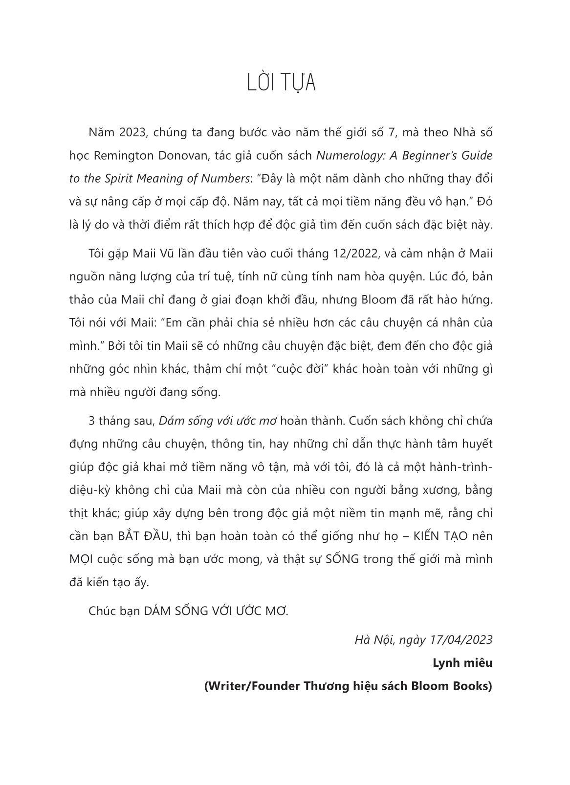 Dám Sống Với Ước Mơ Khi bạn cầm cuốn sách này trên tay thì đó là dấu hiệu đã đến lúc bạn cần nghiêm túc xem xét lại về những gì m.ình luôn thầm ao ước: sự tự do, sự nghiệp, tiền bạc, tình yêu, thời gian, hạnh phúc gia đình hay bất cứ khía cạnh nào khác. Dám sống với ước mơ không phải là một cuốn sách truyền động lực đơn thuần mà là một cuốn sách “hướng dẫn sử dụng cuộc đời”song hành dài hạn cùng bạn. Những công cụ trong sách đều đơn giản và tinh gọn, để ngay cả những người phụ nữ đã có gia đình với nhiều mối bận tâm vẫn có thể thực hành chạm tới những ước mơ đầu tiên và cả những ước mơ lớn hơn sau đó – thậm chí là những ước mơ bạn chưa từng tưởng tượng ra!