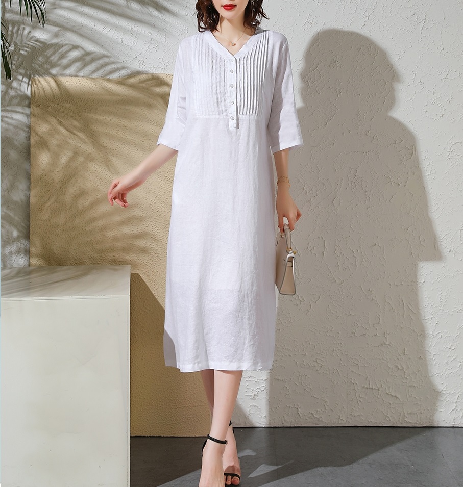 ✨Đầm suông trắng linen phối cúc, thiết kế cổ V thanh lịch, đầm có túi tiện lợi NH190