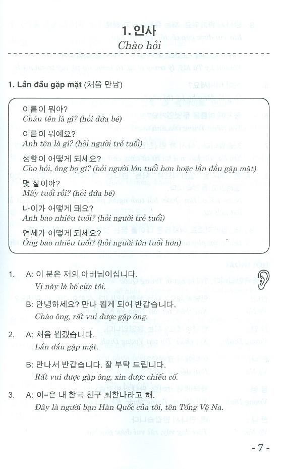 Sách gồm 5 phần, trình bày nhiều mẫu đàm thoại tiếng Hàn theo từng tình huống giao tiếp trong thực tế. Từ việc chào hỏi và giới thiệu vào lần đầu gặp mặt, cách nói lời cảm ơn hay xin lỗi, cách giao tiếp trong cuộc sống hằng ngày, cho đến các tình huống giao tiếp trong các hoạt động vui chơi giải trí, trong du lịch và giáo dục.