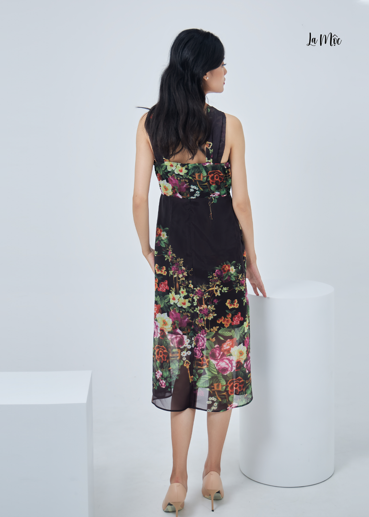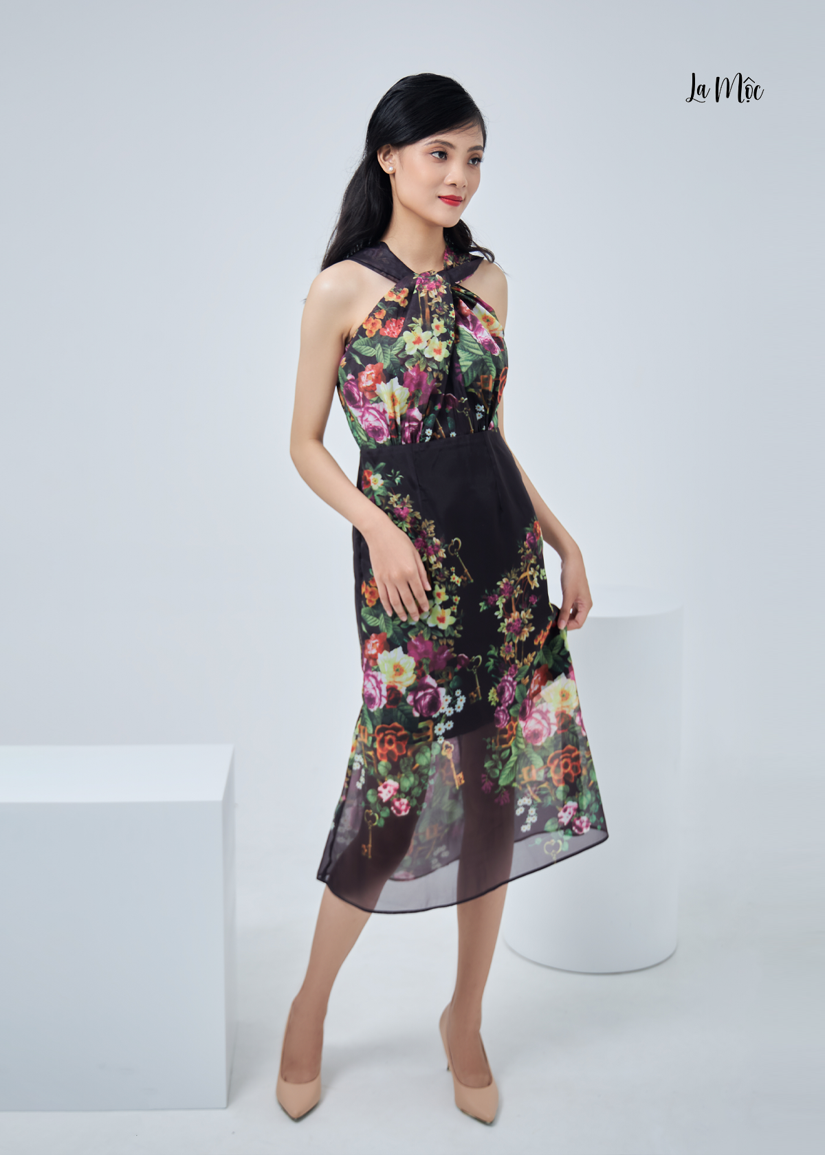 Mua tại TiktokĐầm voan cổ yếm La Mộc dáng ôm body, họa tiết hoa, xòe nhẹ phần chân váy, ôm phần eo khoét lưng.