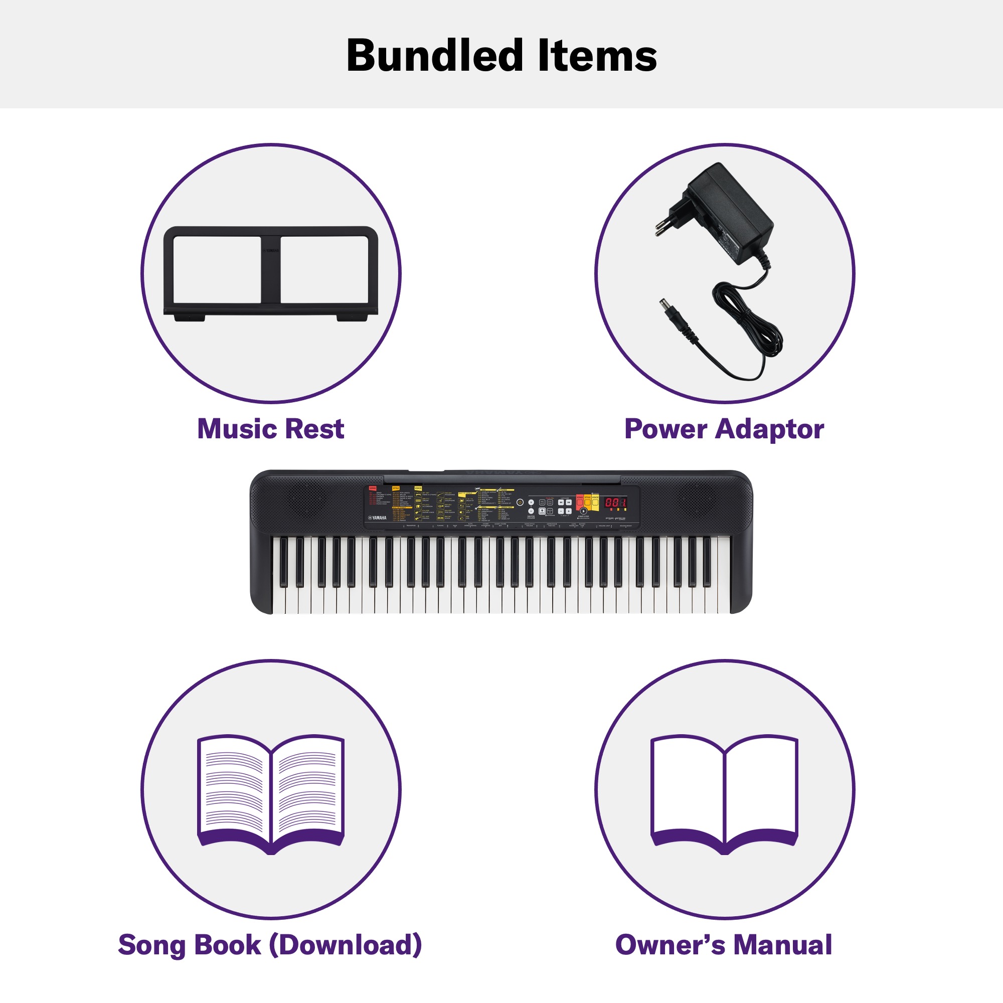 Hơn nữa, PSR-F52 được trang bị nhiều tính năng dành cho người chơi ở mọi cấp độ kinh nghiệm. Có thể tải xuống miễn phí Sách nhạc với đầy đủ các giai điệu chuẩn, video bài học, chức năng Hợp âm thông minh để sử dụng Kiểu nhạc mà không cần biết cách chơi hợp âm… và nhiều hơn nữa!
