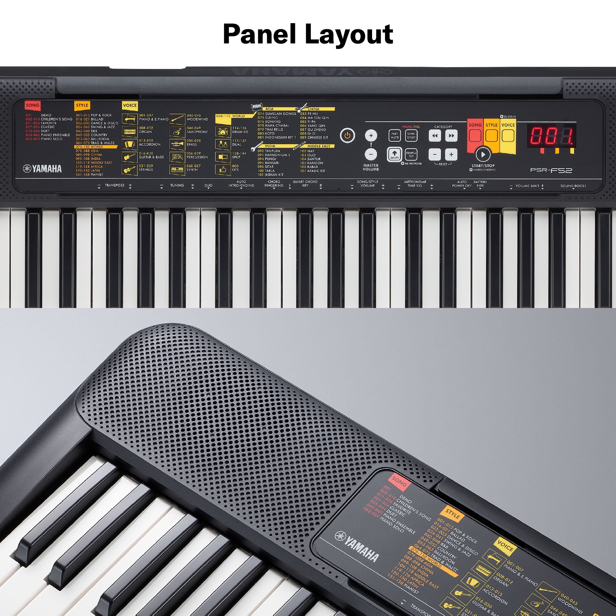 Không chỉ có piano, guitar hay nhạc cụ hơi, Yamaha PSR-F52 được trang bị các âm thanh nhạc cụ (Voices) rất cần thiết để biểu diễn âm nhạc của nhiều vùng miền khác nhau. Chức năng tự động đệm (Styles) mang lại cảm giác thú vị khi chơi với một ban nhạc ảo và có nhiều phong cách không chỉ là các thể loại tiêu chuẩn như rock hoặc jazz mà còn cả những phong cách thể hiện nét tinh túy của âm nhạc được yêu thích ở nhiều quốc gia khác nhau.