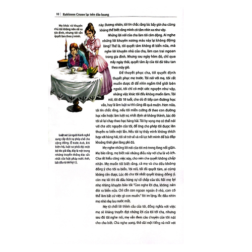 Câu chuyện gồm 9 chương được kể lại qua lời văn chân thực, giàu sức biểu cảm cùng những tranh vẽ minh họa sinh động tái hiện lại cuộc sống hoang dã trên đảo của Robinson sẽ hấp dẫn các độc giả nhỏ tuổi qua từng trang truyện. Đằng sau câu chuyện là bài học ý nghĩa về cuộc sống, bài học về cách sống bằng chính đôi tay mình làm ra.