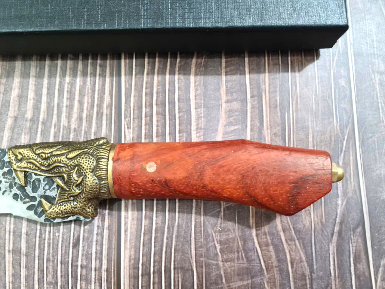 Chất liệu tay cầm: gỗ cẩm lai, khâu và chuôi cuối dao bằng đồng thau