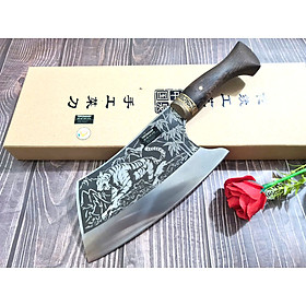 - Chức năng: Chặt xương ống, chân giò, trâu bò - Kích thước: Lưỡi: 22cm, cán: 10cm, rộng: 10cm, dầy: 5ly, trọng lượng: 800g - Cán : Gỗ mun, Khâu đồng đỏ , chốt đinh