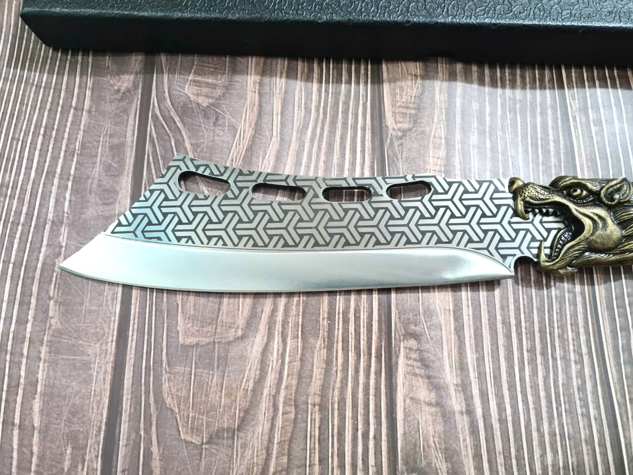 - DAO TR12 : Chiều dài TỔNG: 45cm Chiều dài lưỡi: 24.5cm Chiều rộng lưỡi: 7.5cm, Độ dày lưỡi: 6mm Trọng lượng: 1kg chất liệu lưỡi : 7Cr17MOV (thép 7 crom 17 molypden vanadi) Chất liệu tay cầm: gỗ cẩm lai, phụ kiện khâu đầu hổ và chuôi bằng đồng