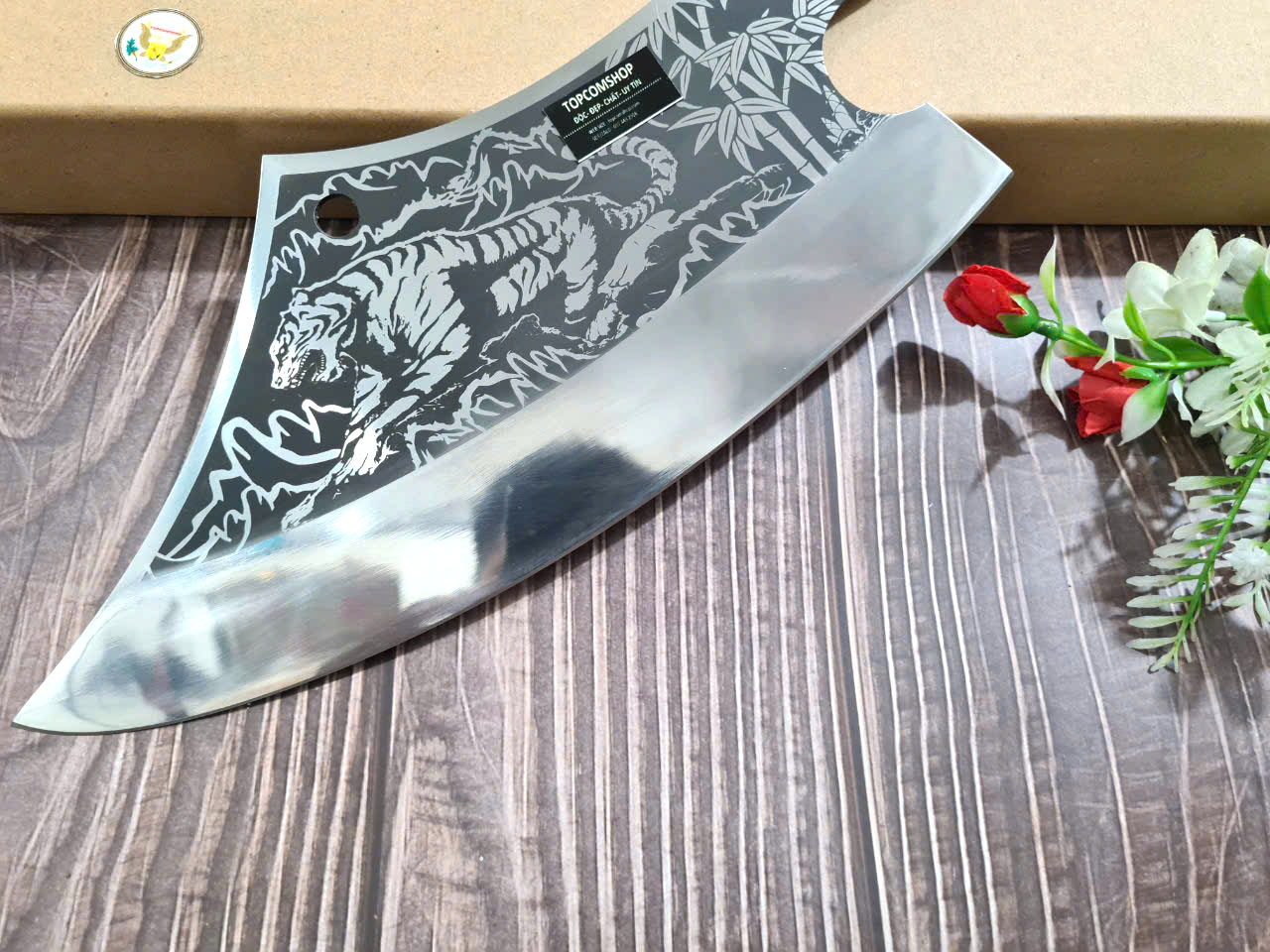 MÔ TẢ SẢN PHẨM CHÚ Ý : SẢN PHẨM KHÔNG HAN RỈ, XỈN MÀU THEO THỜI GIAN , CHỊU ĐƯỢC MÔI TRƯỜNG KHẮC NGHIỆT, ẨM ƯỚT. THÔNG TIN SẢN PHẨM **** DAO THÁI CHẶT HOA VĂN HỔ DT150 ều dài TỔNG: 42cm Chiều dài lưỡi...