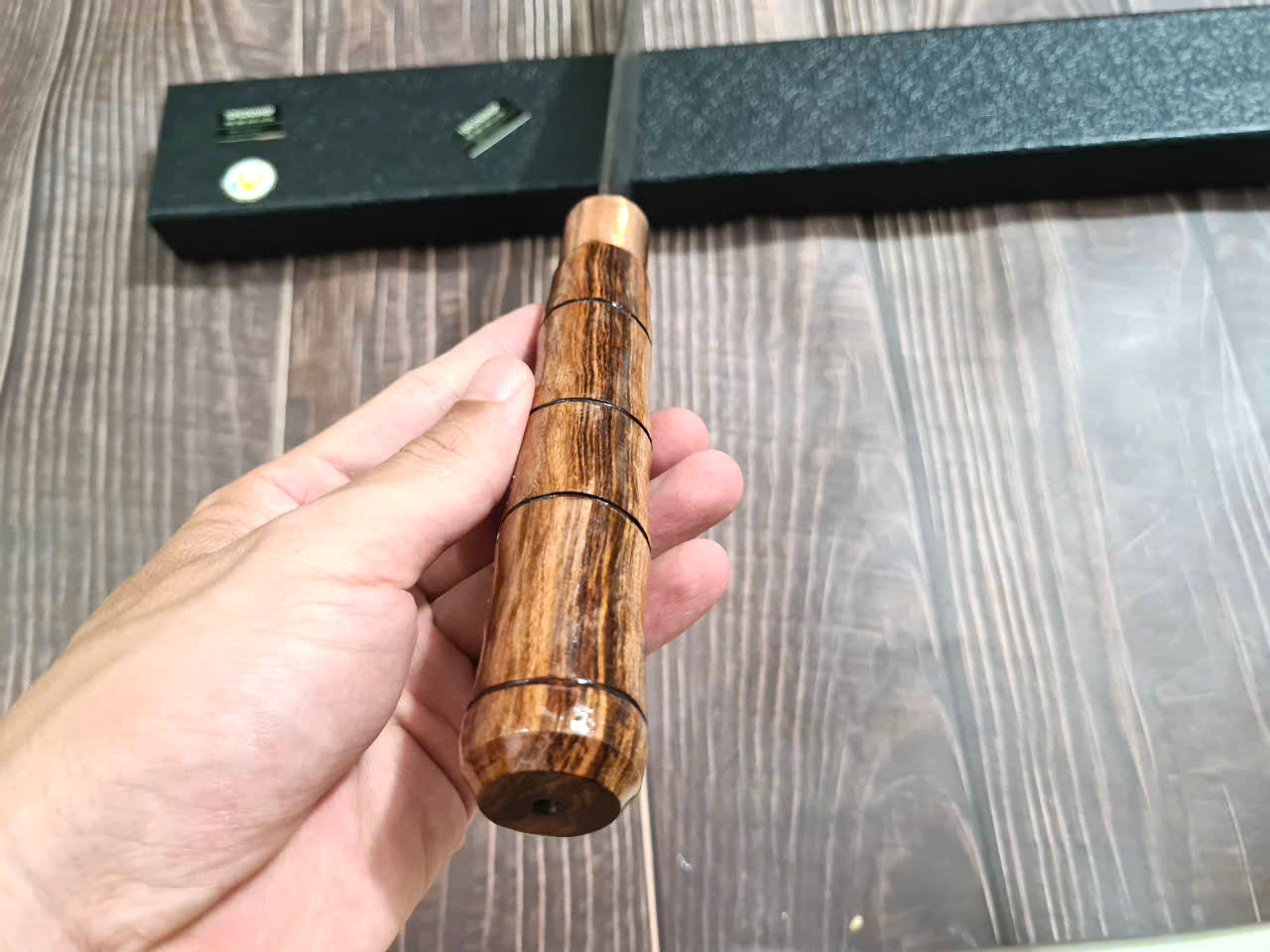 - Chất liệu: 100% thép nhíp ô tô được lựa chọn và kiểm duyệt kỹ càng. - Chất liệu cán: gỗ cẩm chỉ núi - Kích thước: lưỡi: 18cm, cán: 12cm, rộng: 6,5cm, dầy: 0,1,
