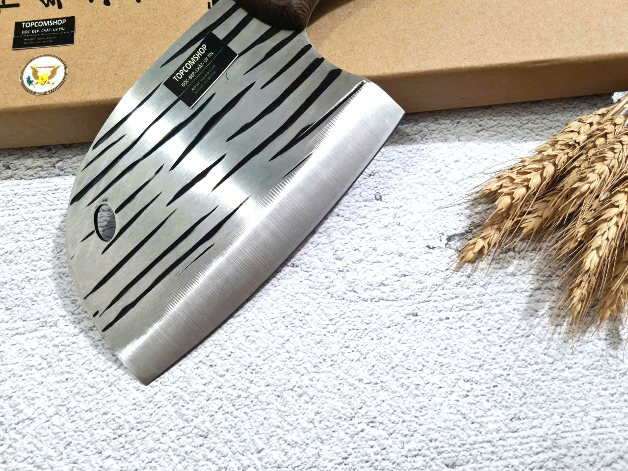 - Chức năng: Chặt xương ống, chân giò, trâu bò - Kích thước: Lưỡi: 22cm, cán: 10cm, rộng: 10cm, dầy: 5ly, trọng lượng: 800g - Cán : Gỗ mun, Khâu đồng đỏ , chốt đinh