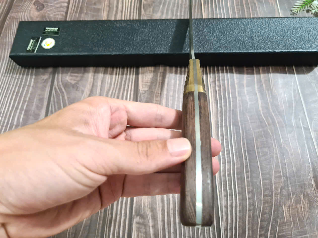 DAO BẾP SASHIMI MẶT HOA VĂN MÃ N4 THÔNG TIN SẢN PHẨM TỔNG DÀI : 45cm, LƯỠI: 30cm,RỘNG : 4cm, dày: 2.5mm, CHẤT liệu lưỡi: thép IFA cao cấp Chất liệu CÁN: gỗ Cẩm chỉ,